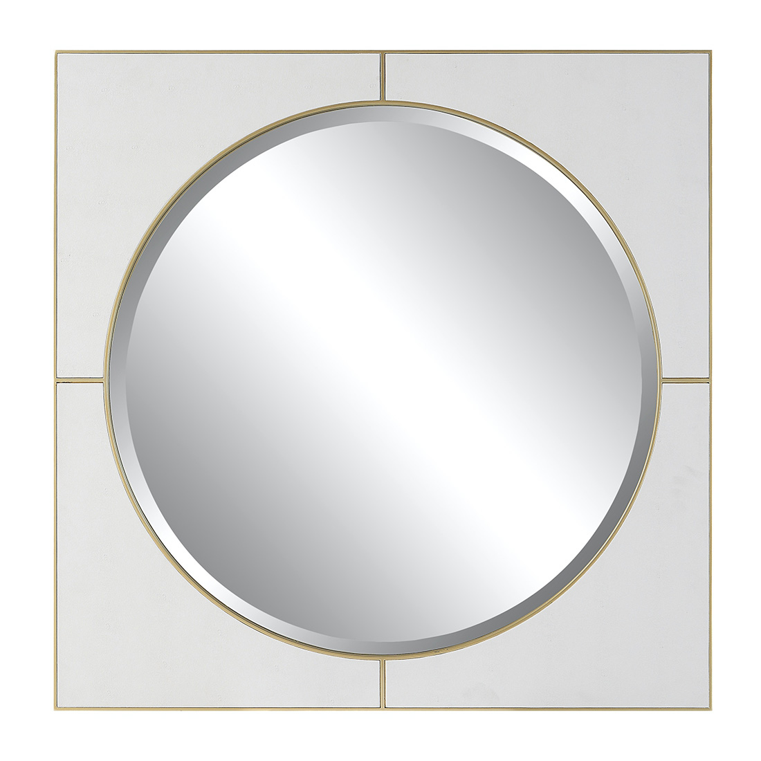 Зеркало Cyprus от премиального американского бренда Uttermost. Рама обтянута белой искусственной шагреневой кожей, обрамленной металлом в отделке мягкое золото. Изделие имеет скос в 3 см.