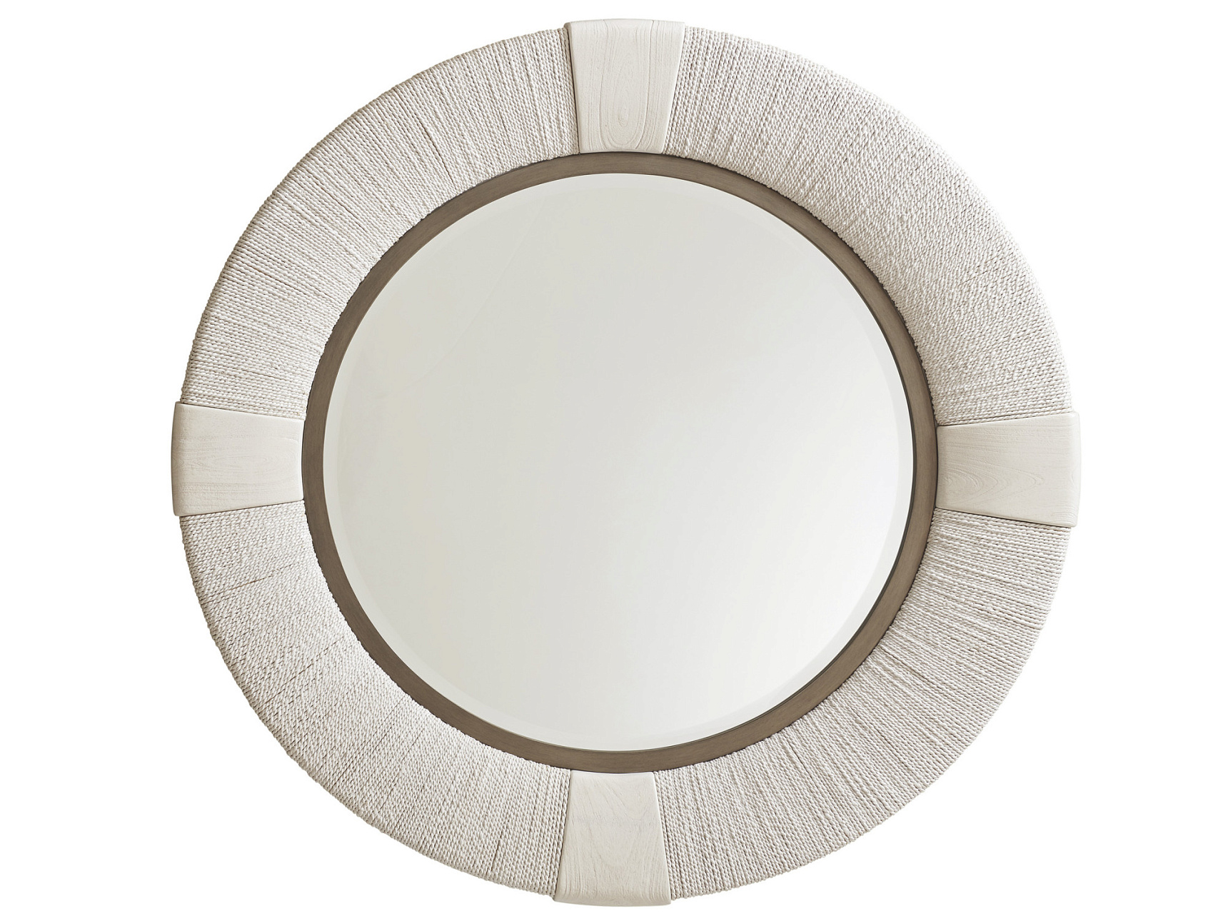 Зеркало Seacroft из коллекции Ocean Breeze от премиального американского бренда Tommy Bahama. Круглая рама состоит из витых стеблей растения Лампаканай и деревянными деталями в отделке Caribbean Sands. Металлические элементы окрашены в цвет полированной оловянной бронзы.