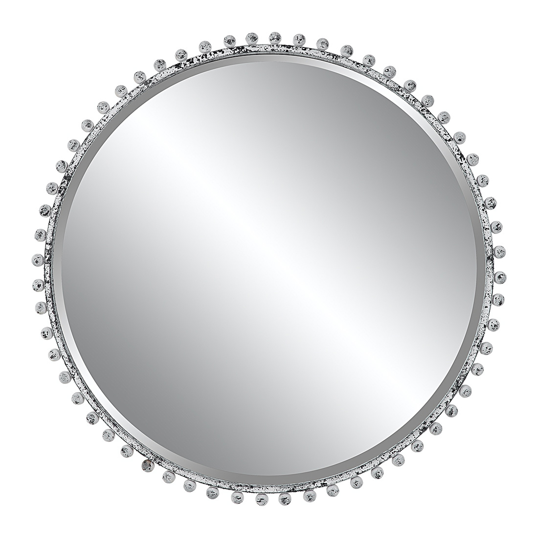 Зеркало Taza от премиального американского бренда Uttermost. Рама выполнена в сильно потертом состаренном белом цвете с черными оттенками. По внешнему краю этой круглой рамы расположены миниатюрные железные сферы. Зеркало имеет скос 1 1/4 дюйма.
