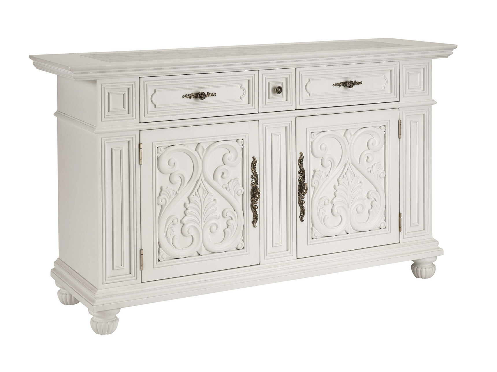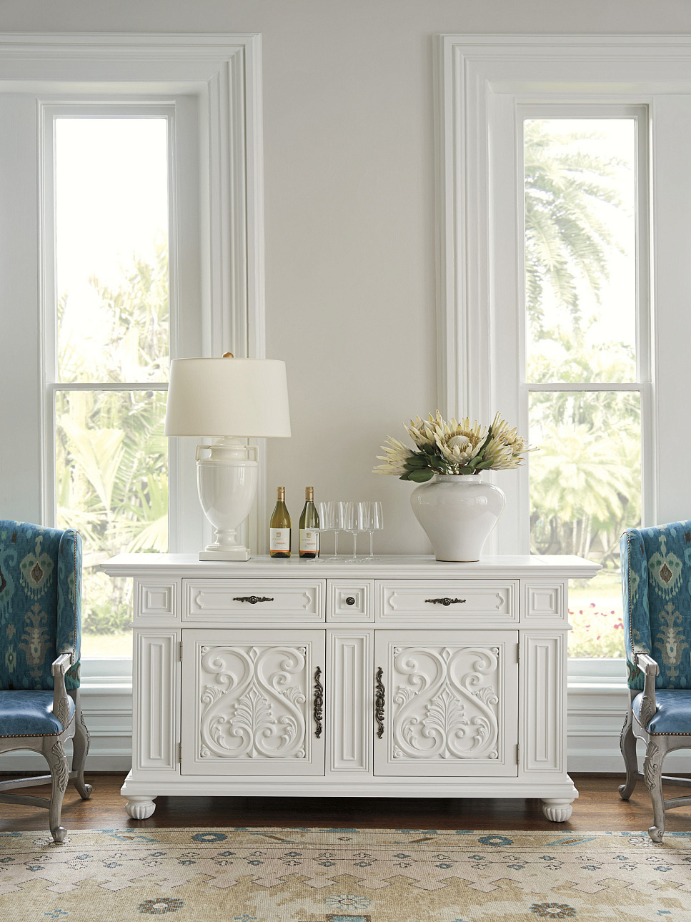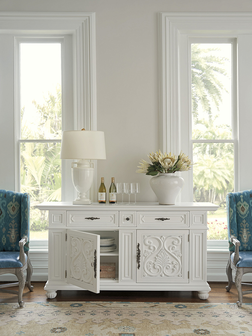 Буфет Amalfi из коллекции Villa Blanca от премиального американского бренда Barclay Butera для Lexington украшен элегантными резными накладками на фасадах дверей и столешницей из полированного каррарского мрамора. В верхней части буфета расположены три функциональных выдвижных ящика. Два крайних ящика оснащены механизмами плавного закрывания. За каждой из нижних дверей находится регулируемая полка.