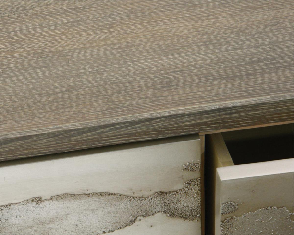 Буфет Audley от премиального американского бренда John Richard. Корпус с отделкой шпоном Американского дуба, тонированного в цвета driftwood. Установлен на стальное основание с шлифованной поверхностью. Фасады дверей оформлены интересным объемный узором, цвета Truro сусальное серебро. Полка регулируется по высоте. Двери и ящики открываются от нажатия на фасад.