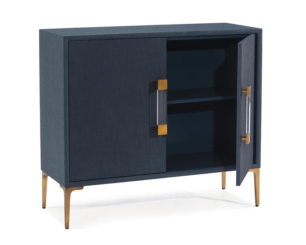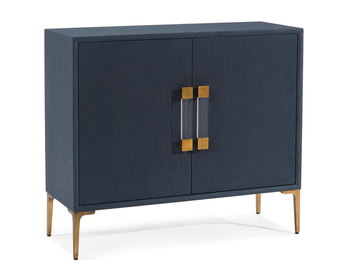 Буфет Aveley от премиального американского бренда John Richard. Корпус с отделкой льняной тканью, тонированной в синий цвет индиго батик. Установлен на алюминиевые ножки цвета латуни. Фасады дверей украшены стальными ручками цвета латуни со вставкой из прозрачного акрила. Полка регулируется по высоте.