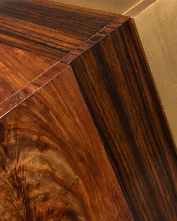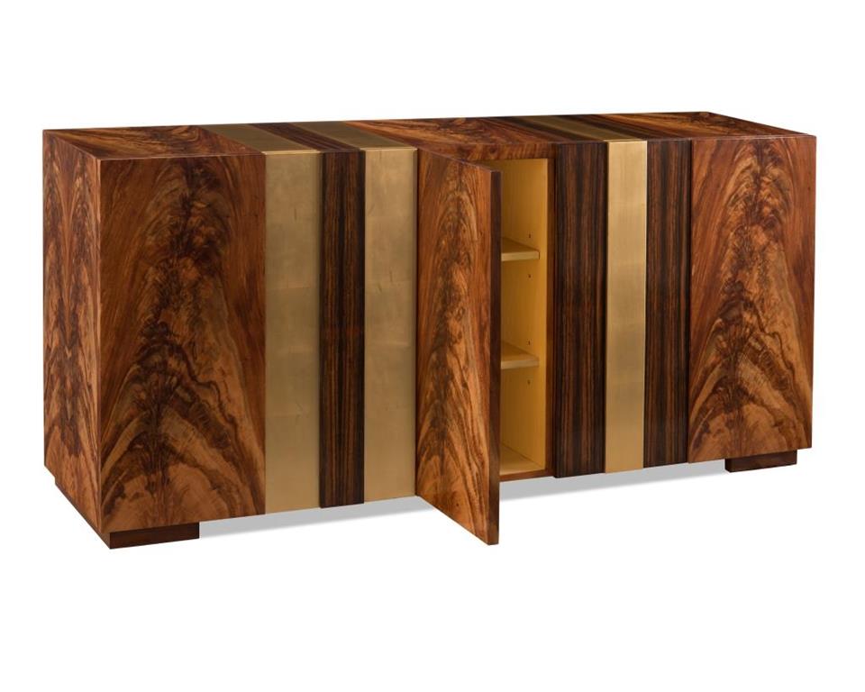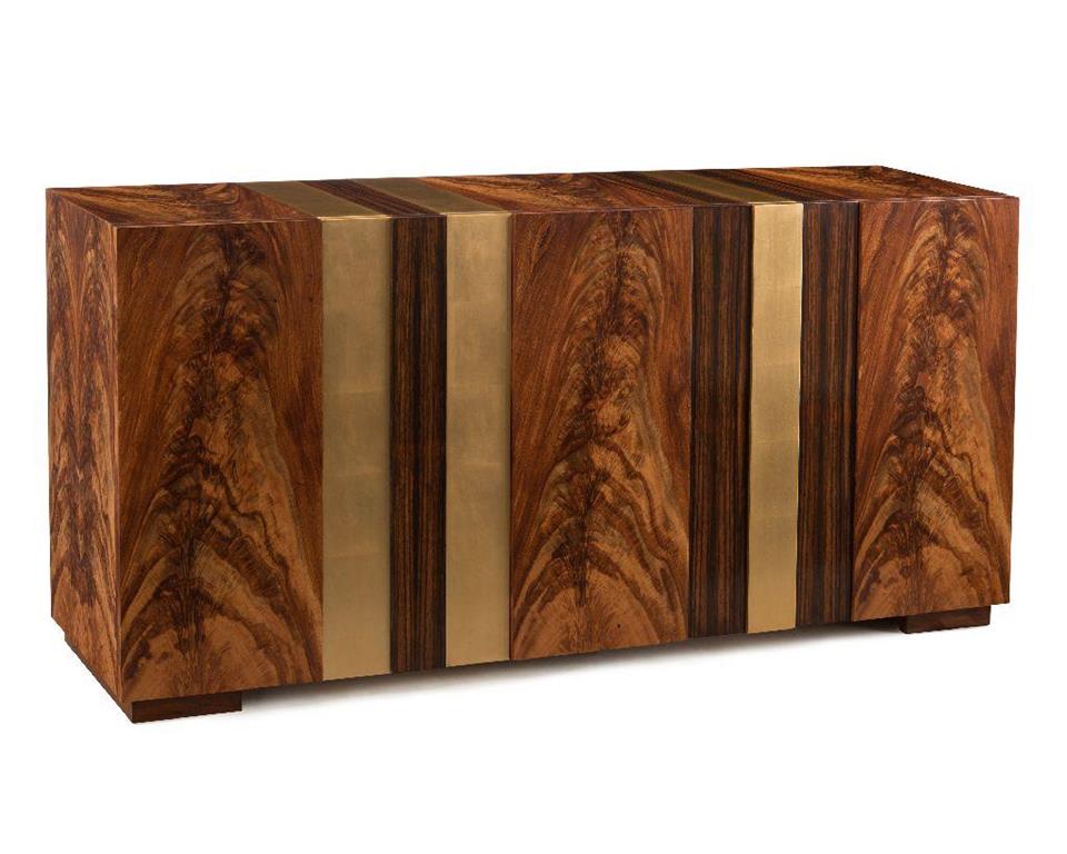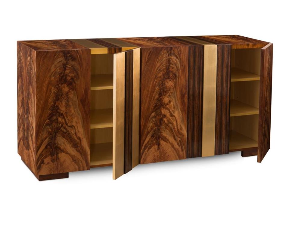 Буфет Bear Run от премиального американского бренда John Richard. Был задуман под влиянием стиля известного Frank Lloyd Wright. Отделка производится дорогим шпоном энтедуа, черным деревом амара и золотыми полосами. Конструкция состоит из трех отделений с двумя полочками за пятью распашными дверцами.