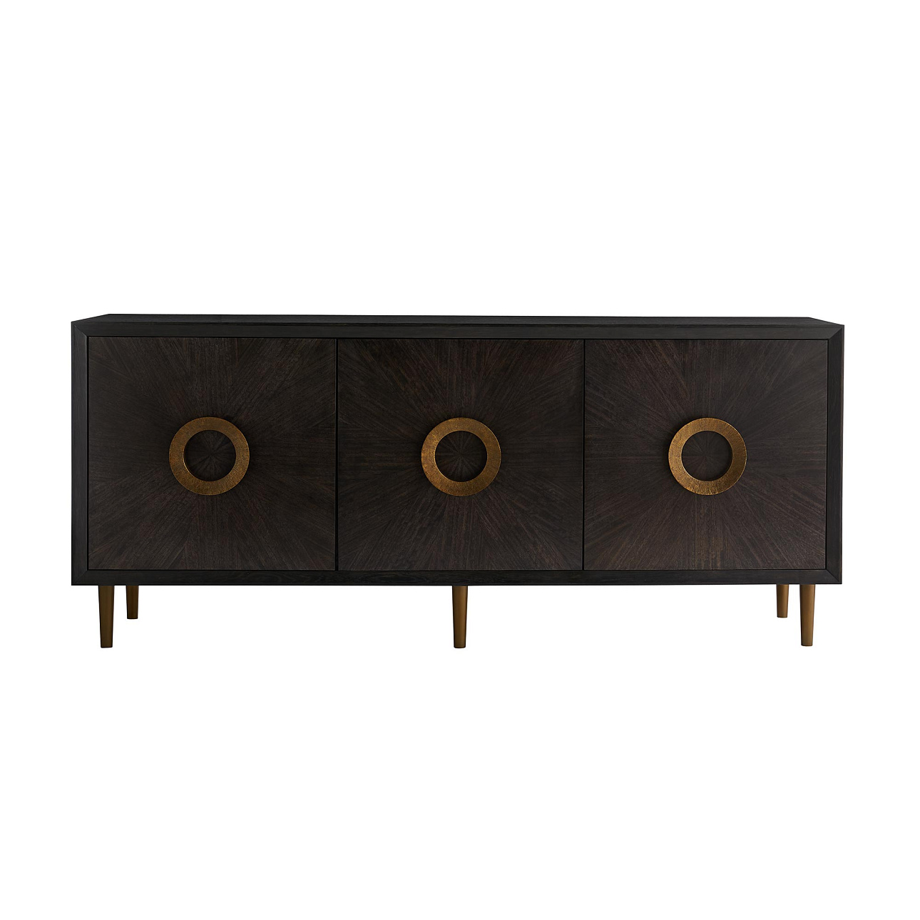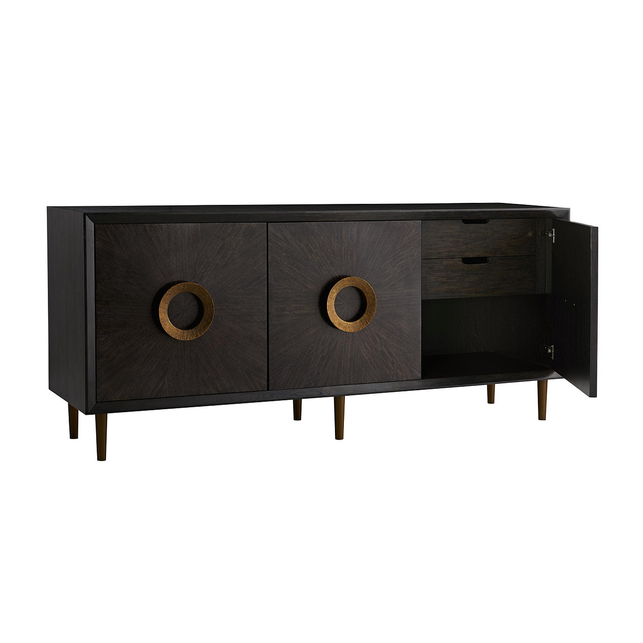 Буфет Normandy от премиального американского бренда Arteriors выполнен из дуба и шпона эвкалипта. Большие ручки дверей сделаны из металла в отделке состаренная латунь. Комод оснащен тремя дверцами. Справа находятся выдвижные ящики с войлочной подкладкой и со вставками для столовых приборов.
