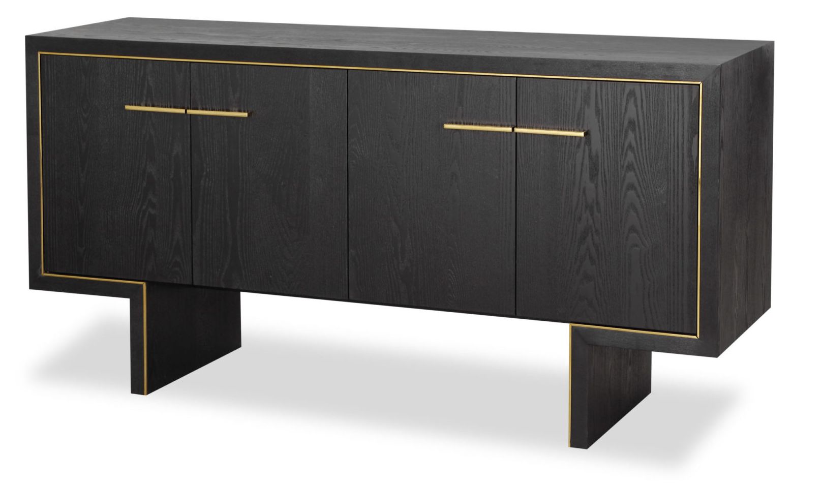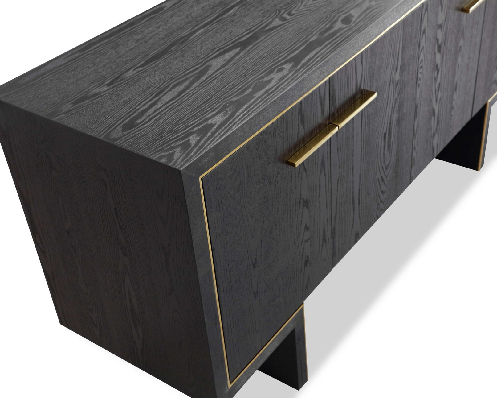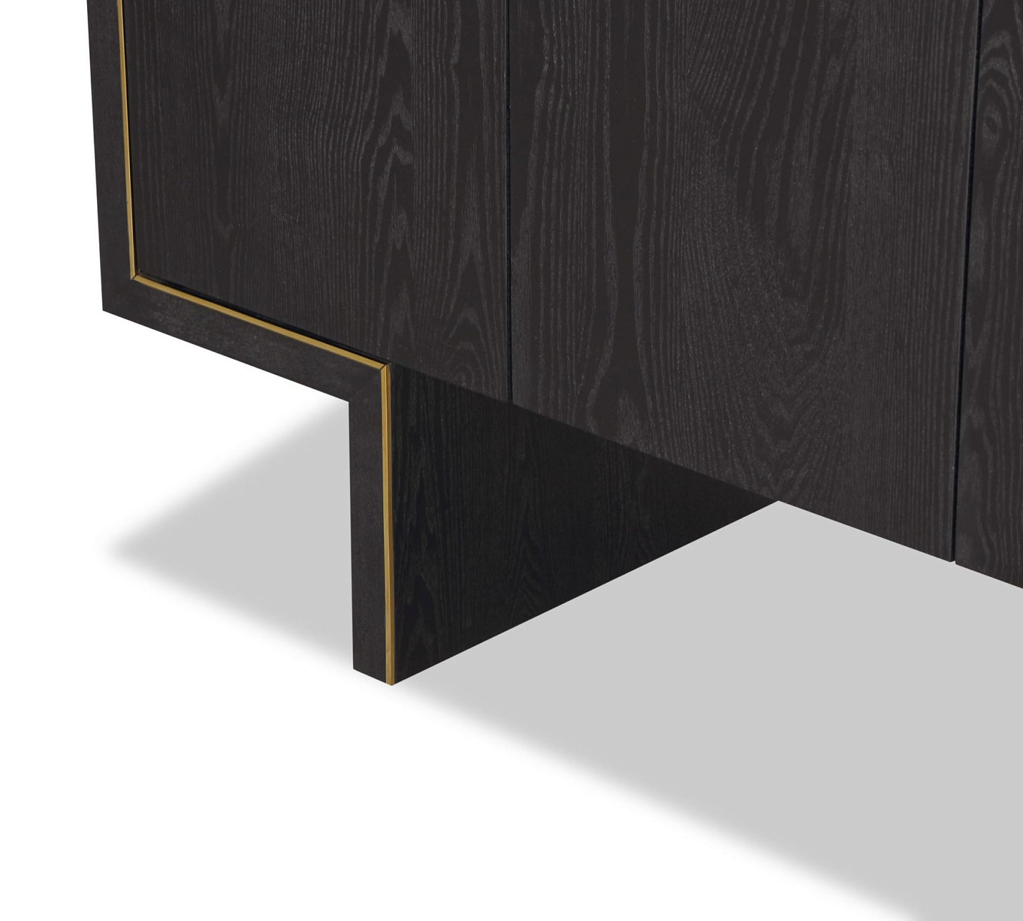 Буфет TIGUR от премиального Английского бренда LIANG AND EIMIL. Состоит из двух отделений, разделенных полками за распашными дверцами. Корпус с отделкой черным шпоном ясеня. На фронтальной поверхности проходит акцентная металлическая вставка цвета латуни, повторяющая изгибы корпуса. Ручки металлические цвета латуни со сдержанным дизайном.