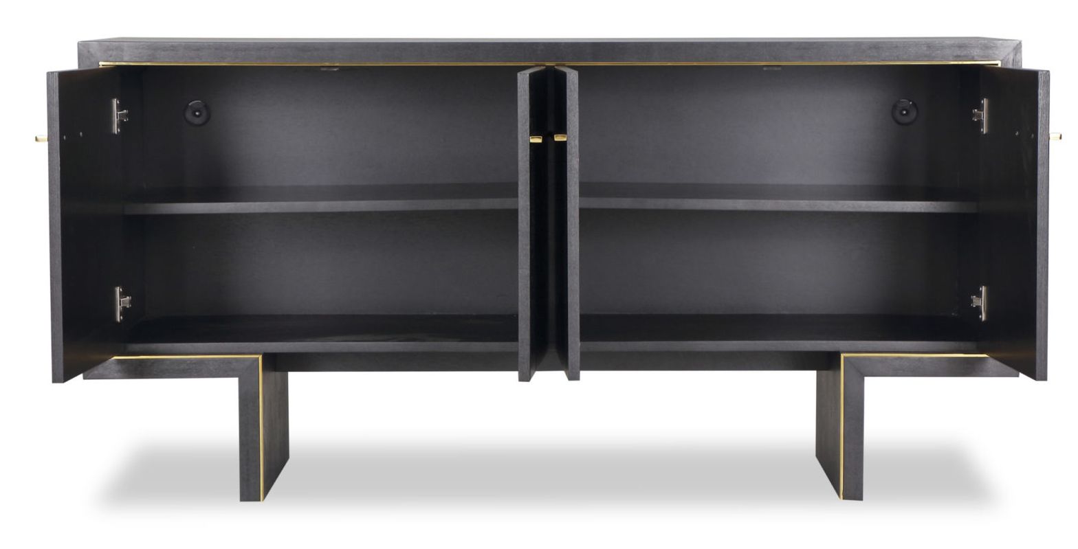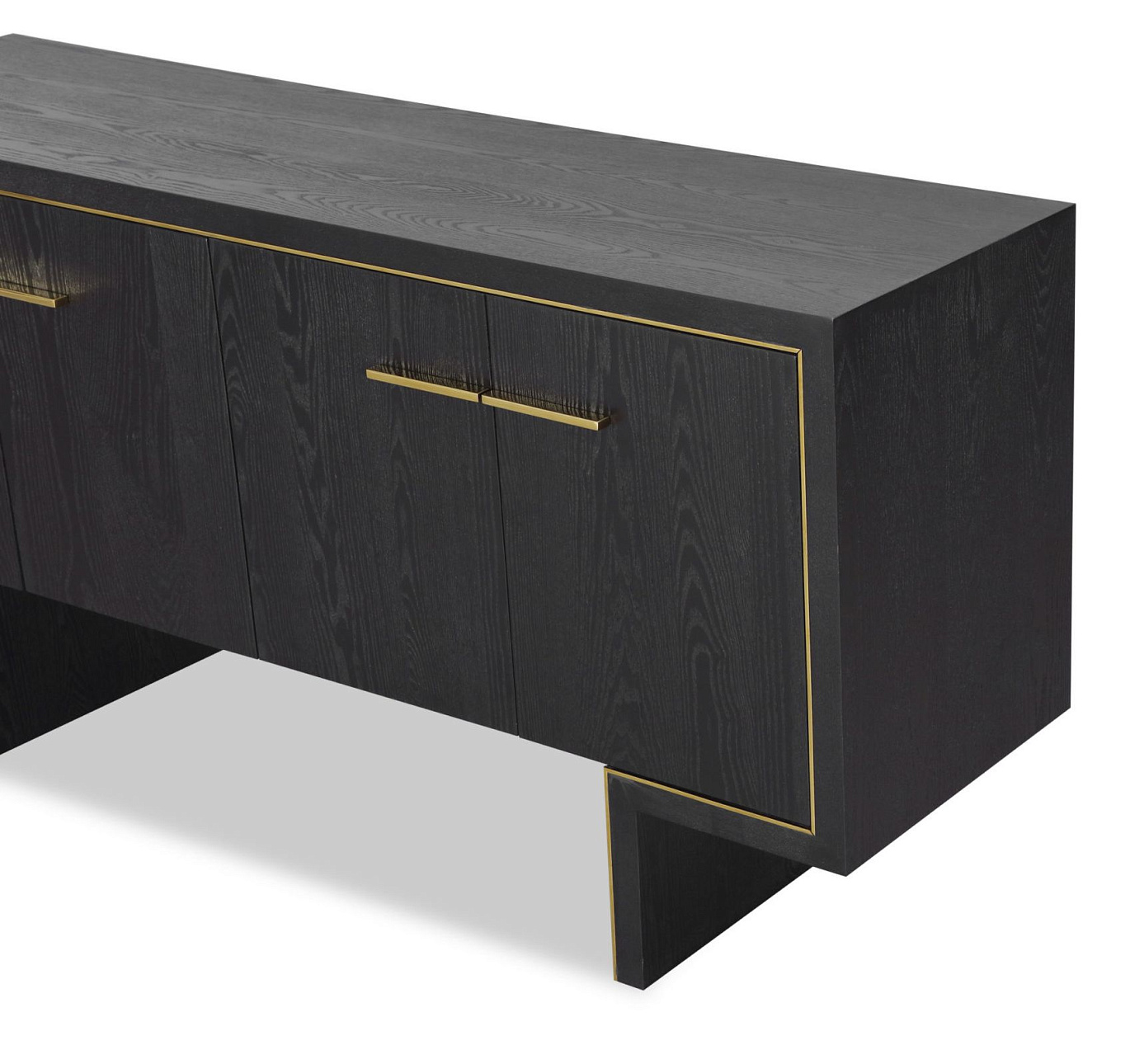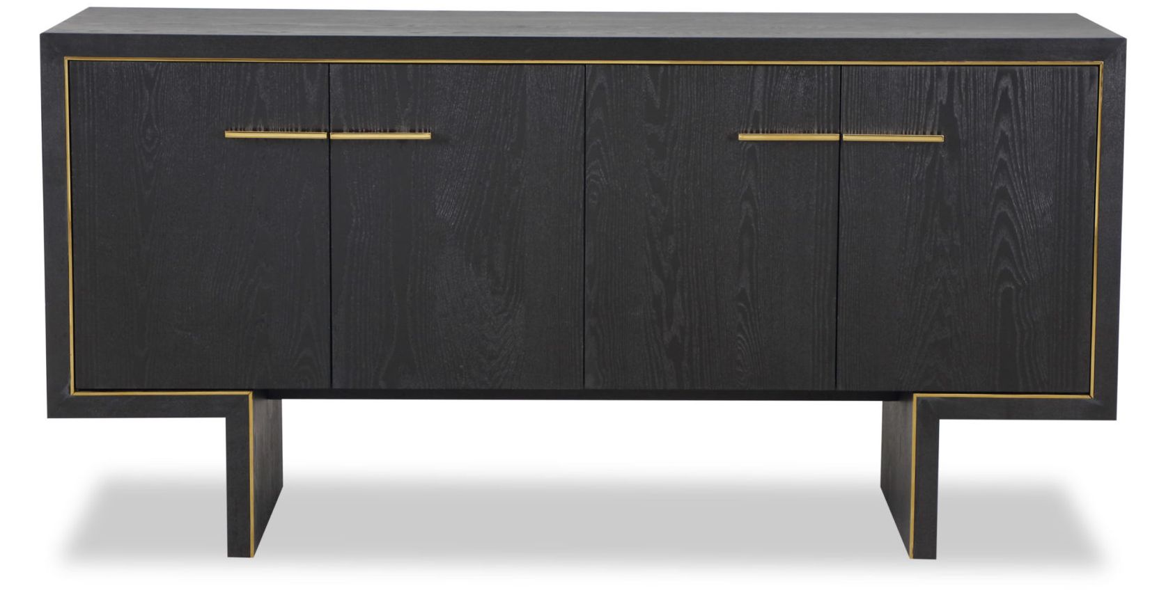 Буфет TIGUR от премиального Английского бренда LIANG AND EIMIL. Состоит из двух отделений, разделенных полками за распашными дверцами. Корпус с отделкой черным шпоном ясеня. На фронтальной поверхности проходит акцентная металлическая вставка цвета латуни, повторяющая изгибы корпуса. Ручки металлические цвета латуни со сдержанным дизайном.