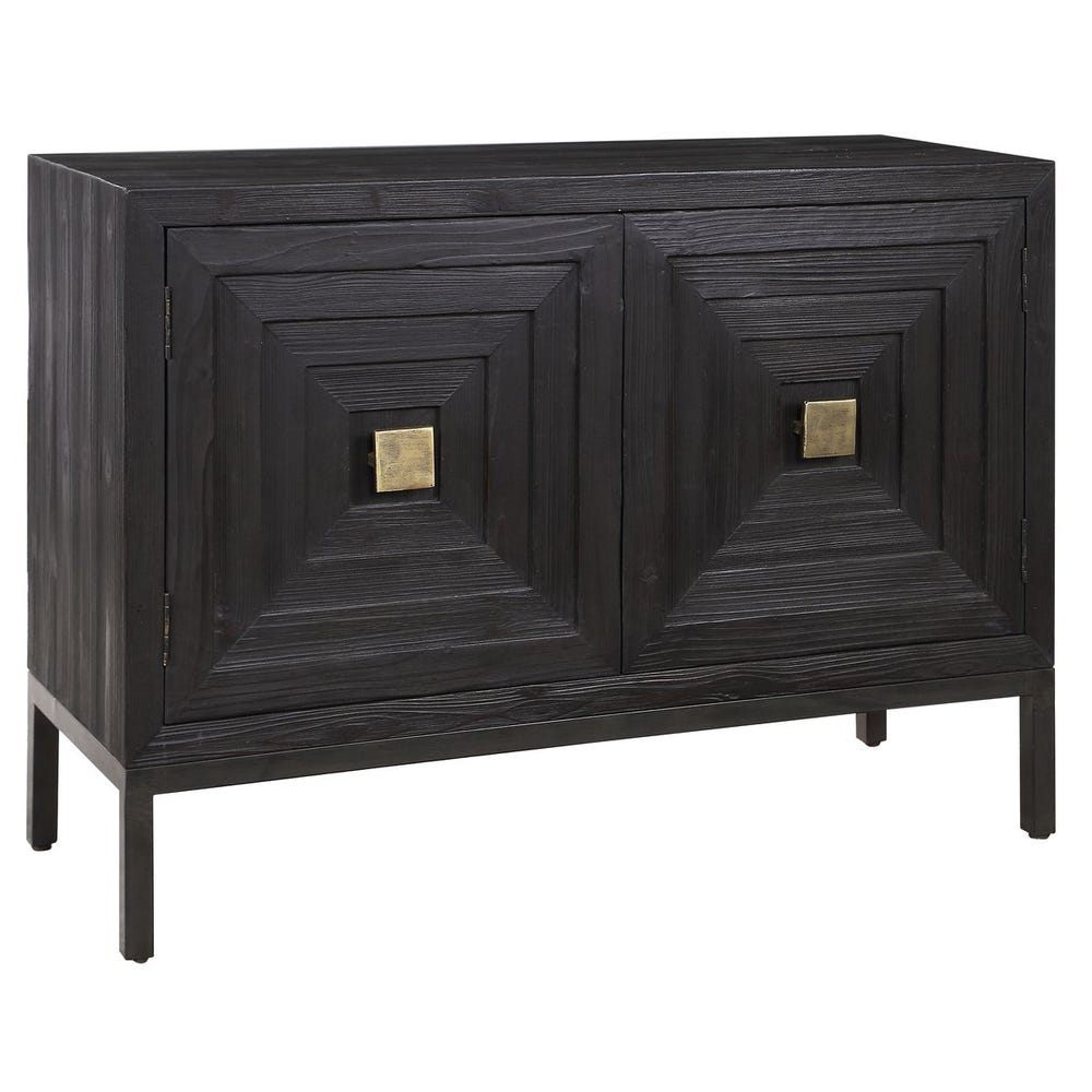 Комод Aiken от американского премиального бренда Uttermost. Современный двухдверный шкаф с геометрическим дизайном, изготовленный из древесины ели, окрашенной в темный цвет эбенового дерева, с фурнитурой из матовой латуни. Имеет одну стационарную внутреннюю полку.
