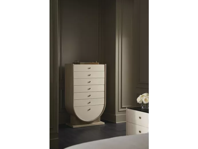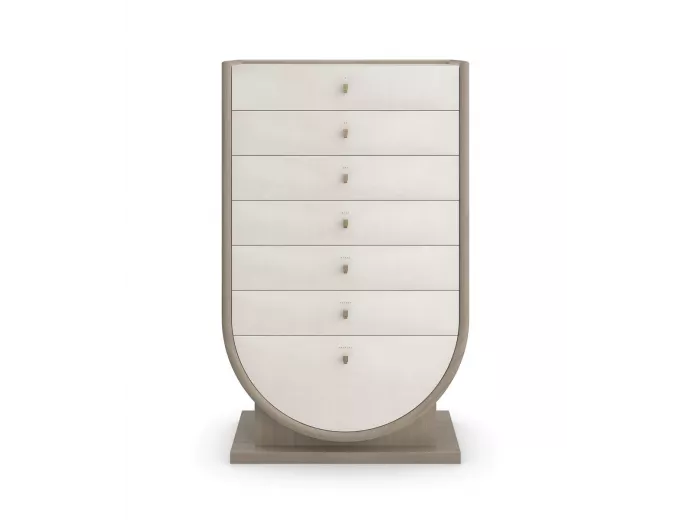 Комод Amphora от премиального американского бренда Caracole изготавливается из дерева кото и тополя в отделке слоновая кость, а также из металла в отделке сухое мартини.