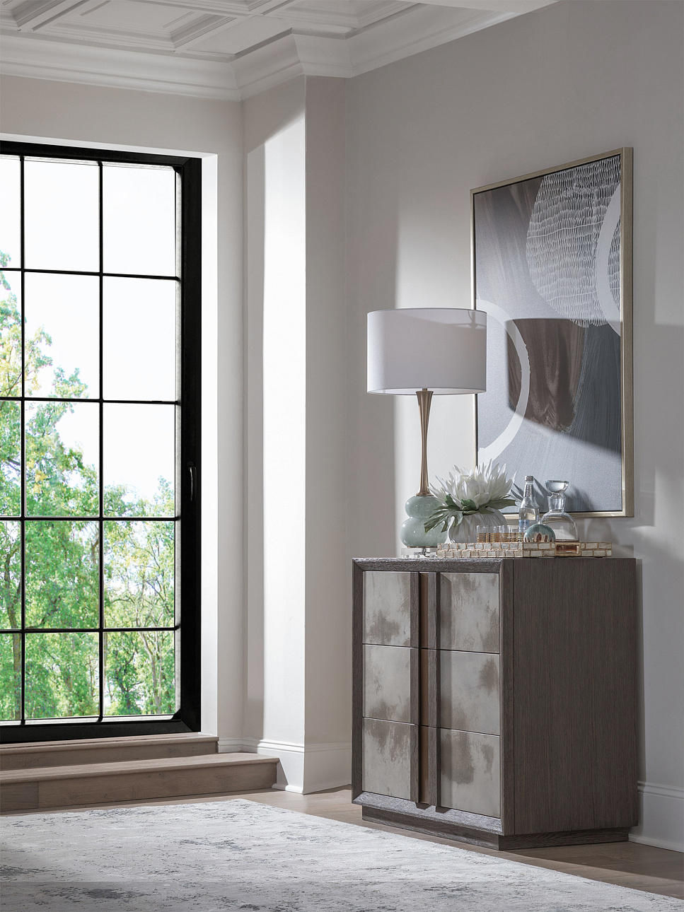 Комод Andare из одноименной коллекции от премиального американского бренда Artistica Home для Lexington. Три выдвижных ящика с промасленным белым пергаментом на фасадах и латунными вставками.