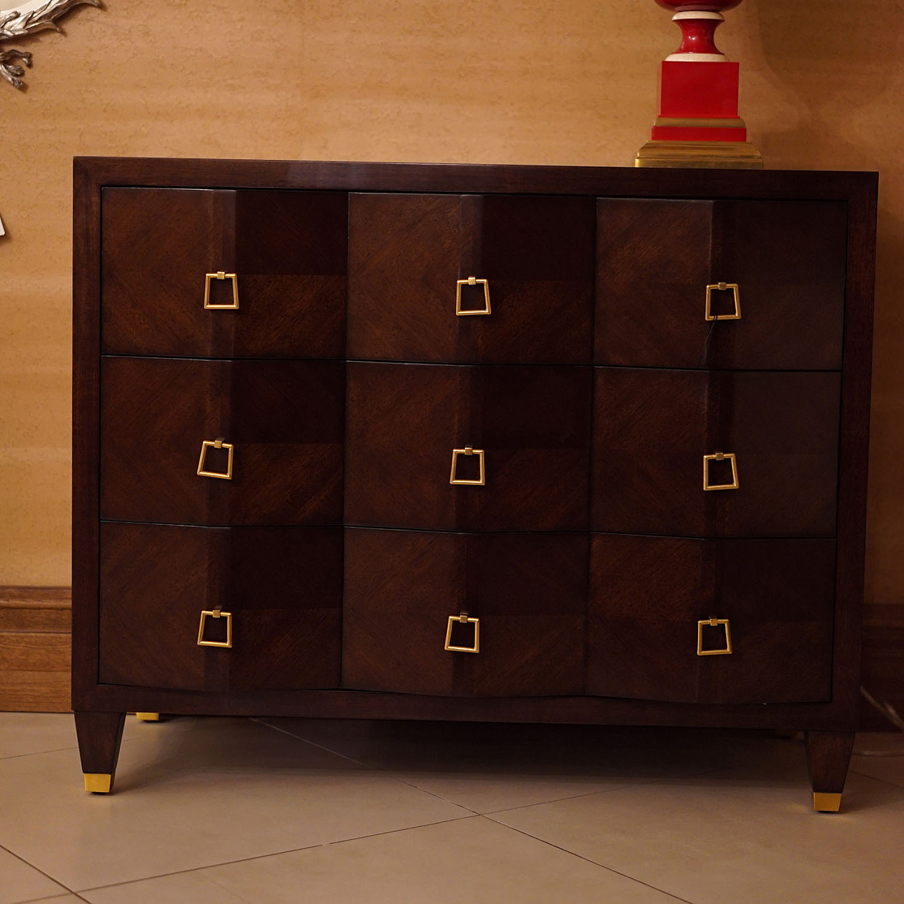 Комод Leif от американского премиального бренда Theodore Alexander изготавливается из красного дерева и металла. Имеет девять выдвижных ящиков.