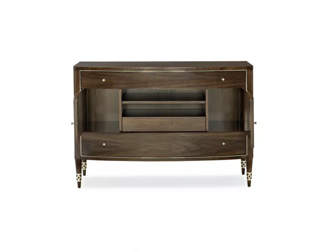 Комод Less Is More от премиального американского бренда Caracole изготавливается из березы и шпона ореха в отделке богатый грецкий орех. Металлические детали в отделке шепот золота. Комод с двумя выдвижными ящиками и двумя дверцами.
