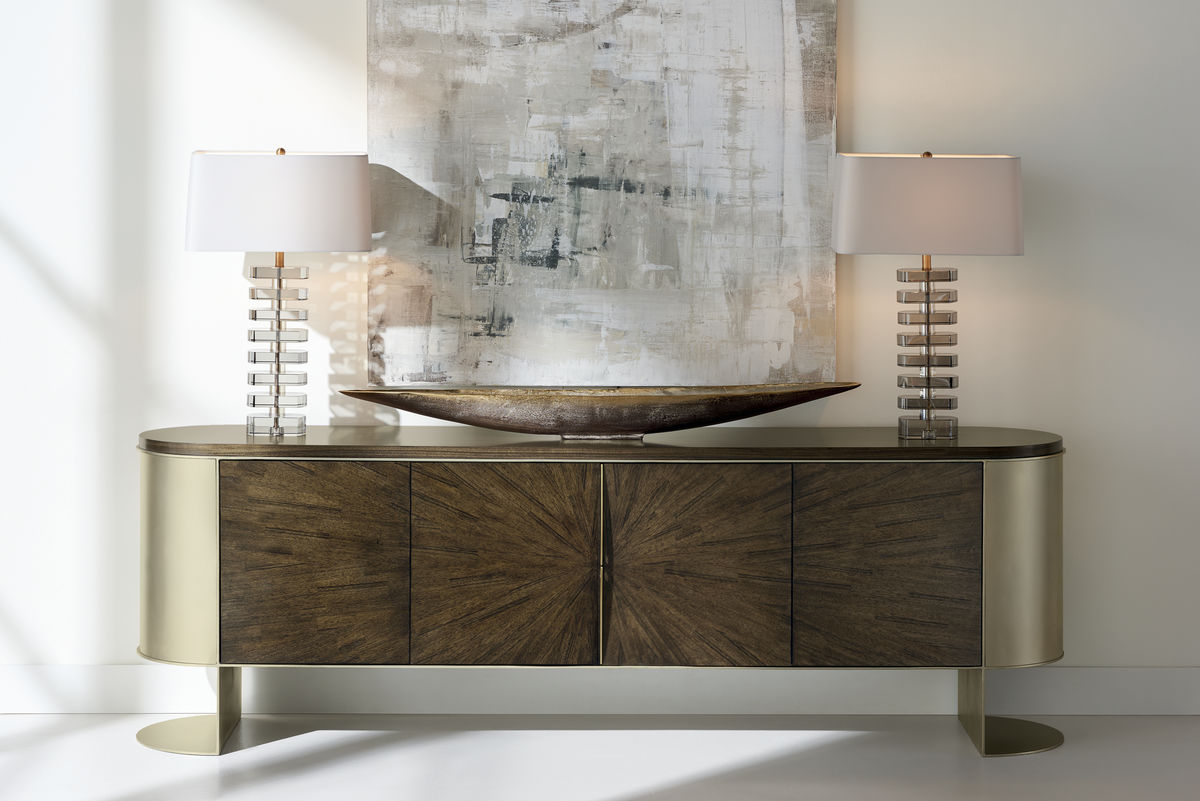 Комод Prime Time от премиального американского бренда Caracole изготавливается из клена и металла в отделке золотое шампанское. За четырьмя распашными дверцами находятся полочки.