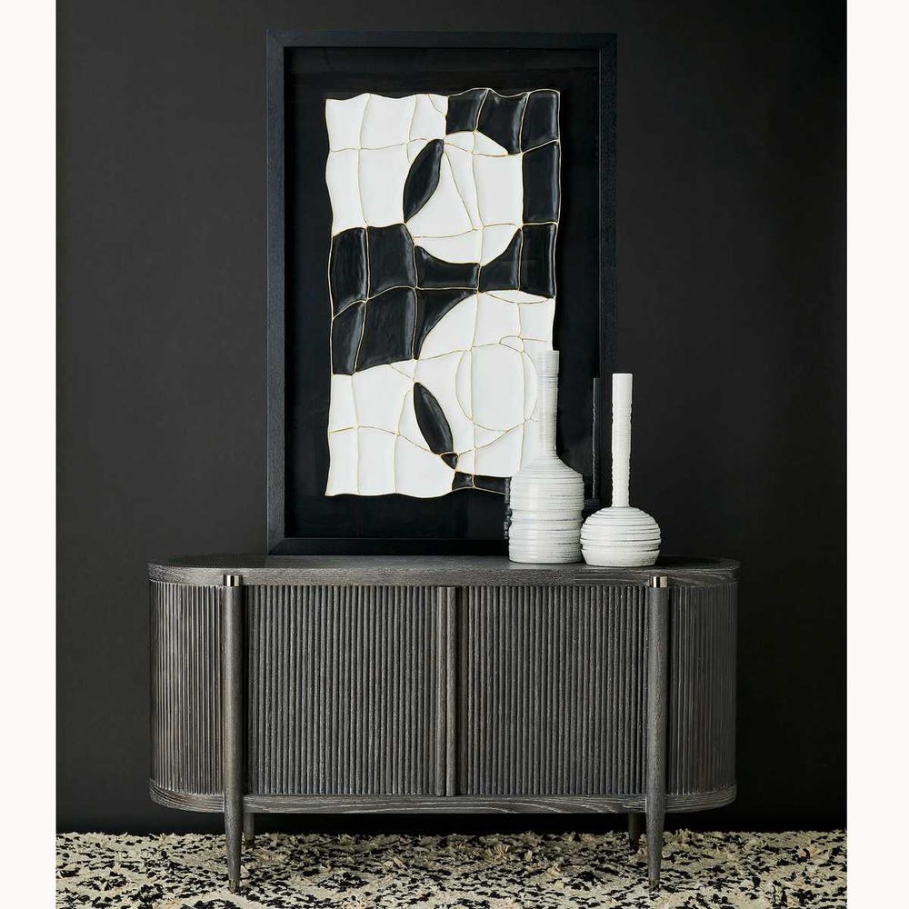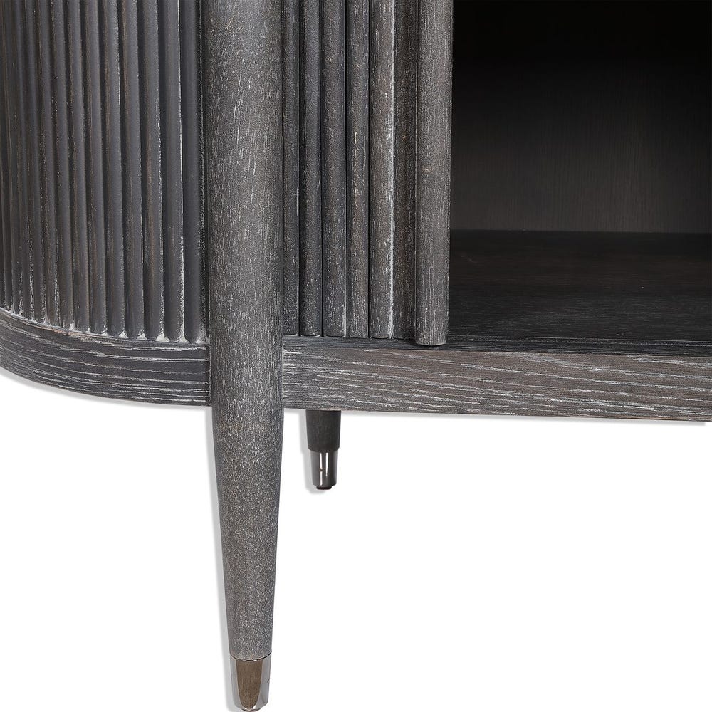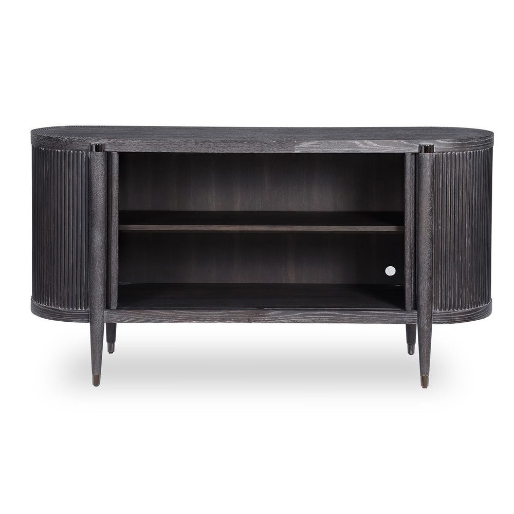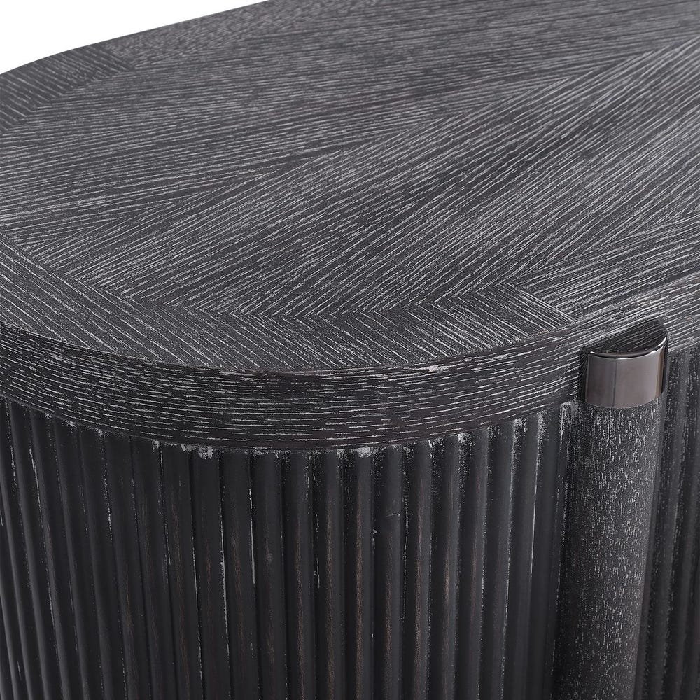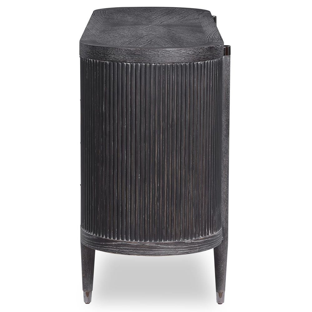 Комод Tambour от премиального американского бренда Uttermost выполнен из американского белого дуба и массива тополя с чёрным покрытием, имитирующим эффект старения. На корпусе расположены полукруглые рейки из дуба, украшенные полированными металлическими заглушками из чёрного никеля. Внутри предусмотрена одна регулируемая полка.