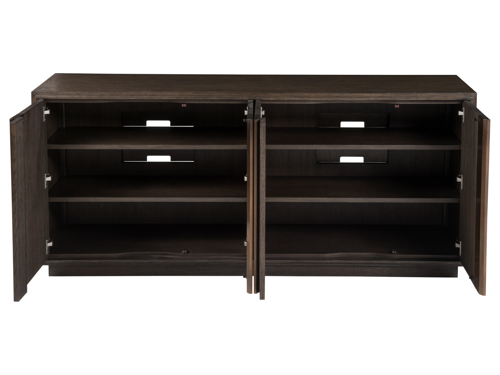 Медиа консоль Andare из одноименной коллекции от премиального американского бренда Artistica Home для Lexington. Модель стандартного размера с четырьмя вертикальными стойками из цельной латуни. Две регулируемые полки за каждой парой дверей и двусторонние сдвижные задние панели для хранения проводов.