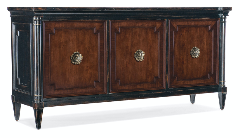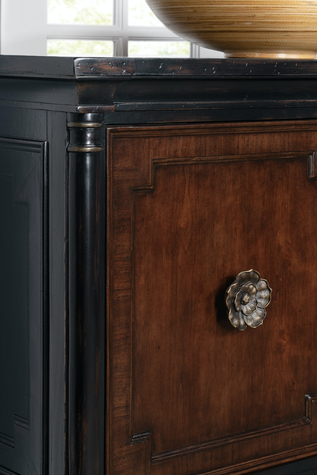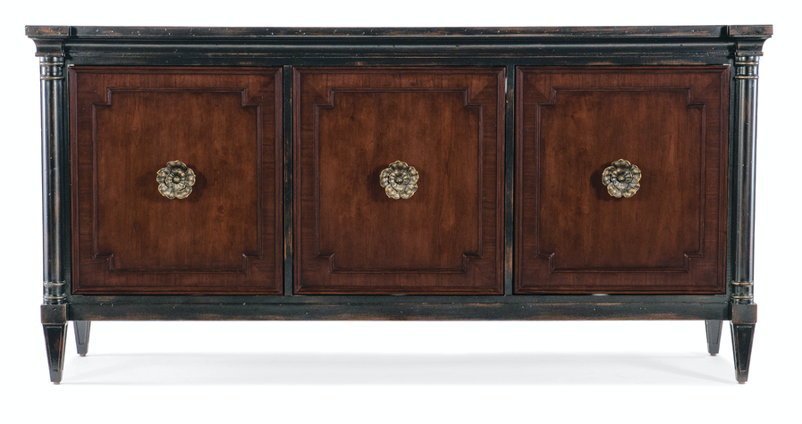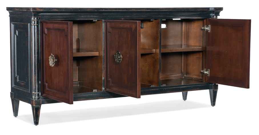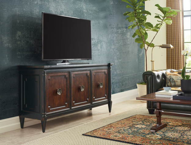 Тумба под ТВ Charleston от американского премиального бренда Hooker Furniture изготовлена из шпона грецкого ореха и вишни с инкрустацией из грецкого ореха, и дополнена столешницей из цельного дерева. Три распашные дверцы оснащены петлями для плавного закрывания и магнитными защелками. За каждой дверцей находится одна регулируемая полка. Также за центральной дверью имеется трехштекерная электрическая розетка. Коллекция Charleston соединяет в себе классический традиционный шарм и обновленное английское наследие, обладает нотками элегантности и эклектичного шарма. Эта коллекция несомненно придется по вкусу многим.