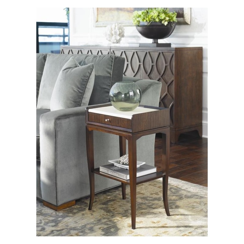 Прикроватная тумба Alameda от американского премиального бренда Century Furniture. Верхняя часть - съемная. Вы легко получаете удобный кожаный поднос кремового цвета. Внутри одного выдвижного отделения текстильный коврик. В нижней части расположена открытая полка. Тумбочка изготовлена из махагона и покрыта шпоном мозамбик.