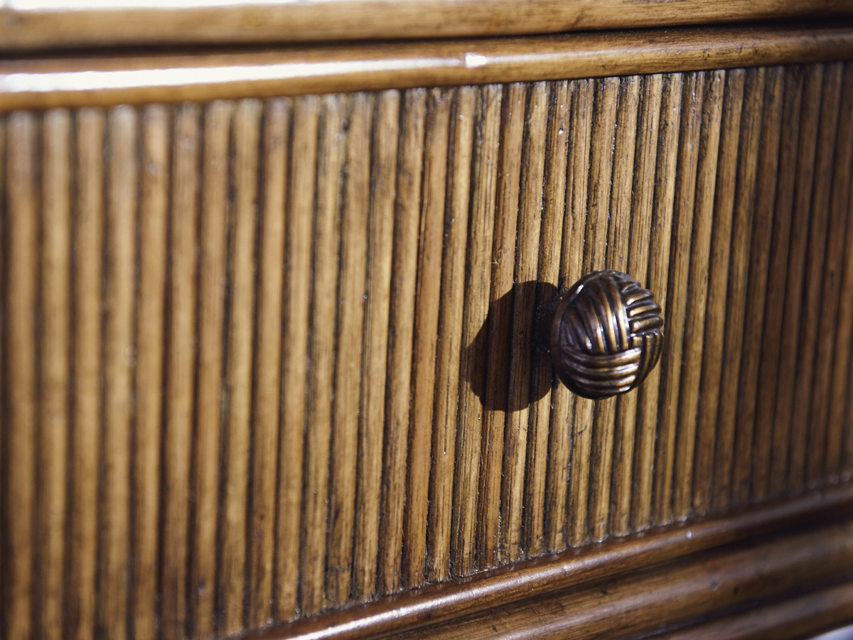 Тумбочка Del Sol из коллекции Bali Hai от премиального американского бренда Tommy Bahama — самая маленькая из трех в этой серии. Она оборудована выдвижным ящиком из ротанга и бамбуковыми стойками с кожаной оплеткой. Ножки выполнены в форме сабель. Одна полка из ротанга позволяет хранить больше вещей, а задняя стенка с отделкой дает возможность разместить тумбочку в любом месте.