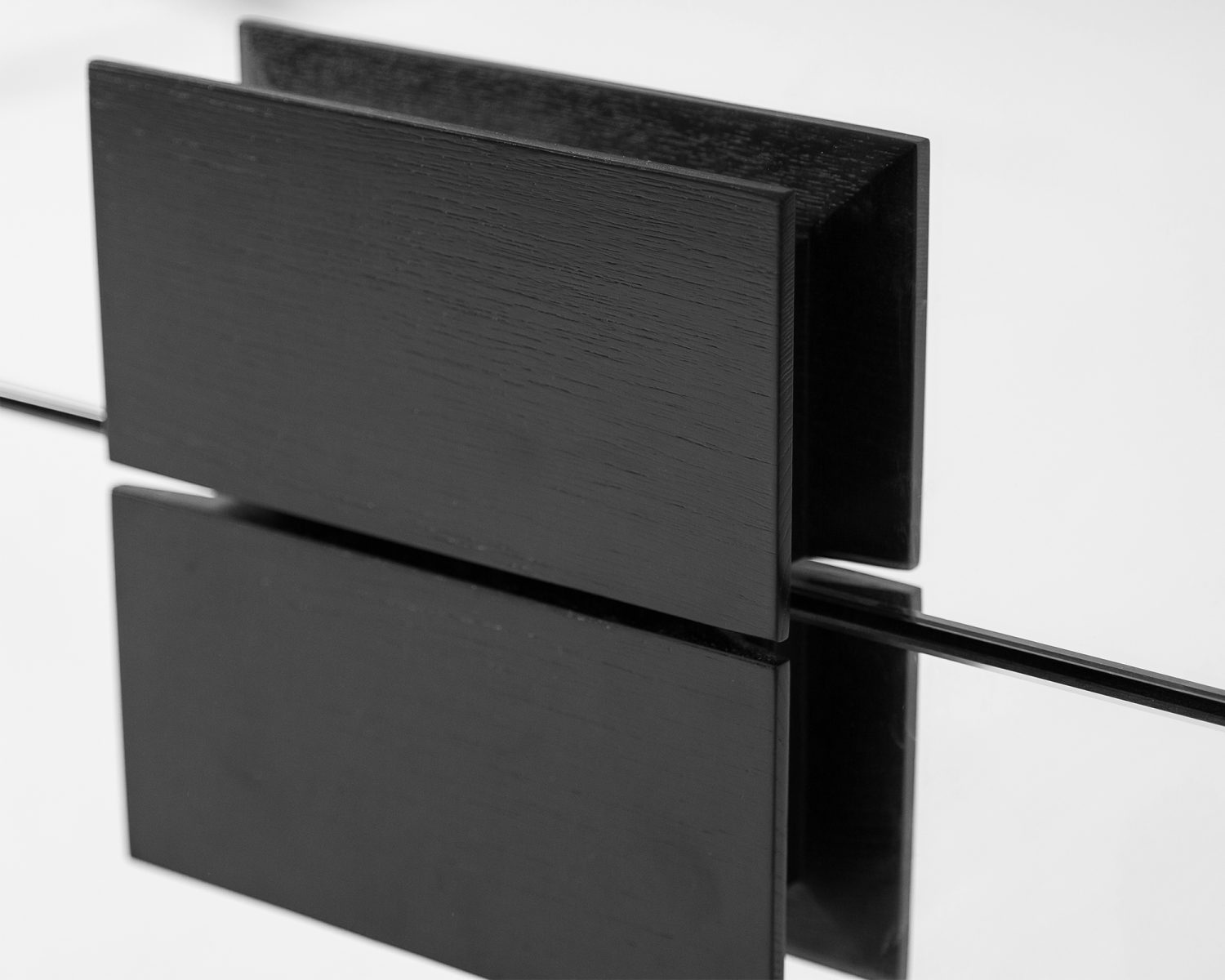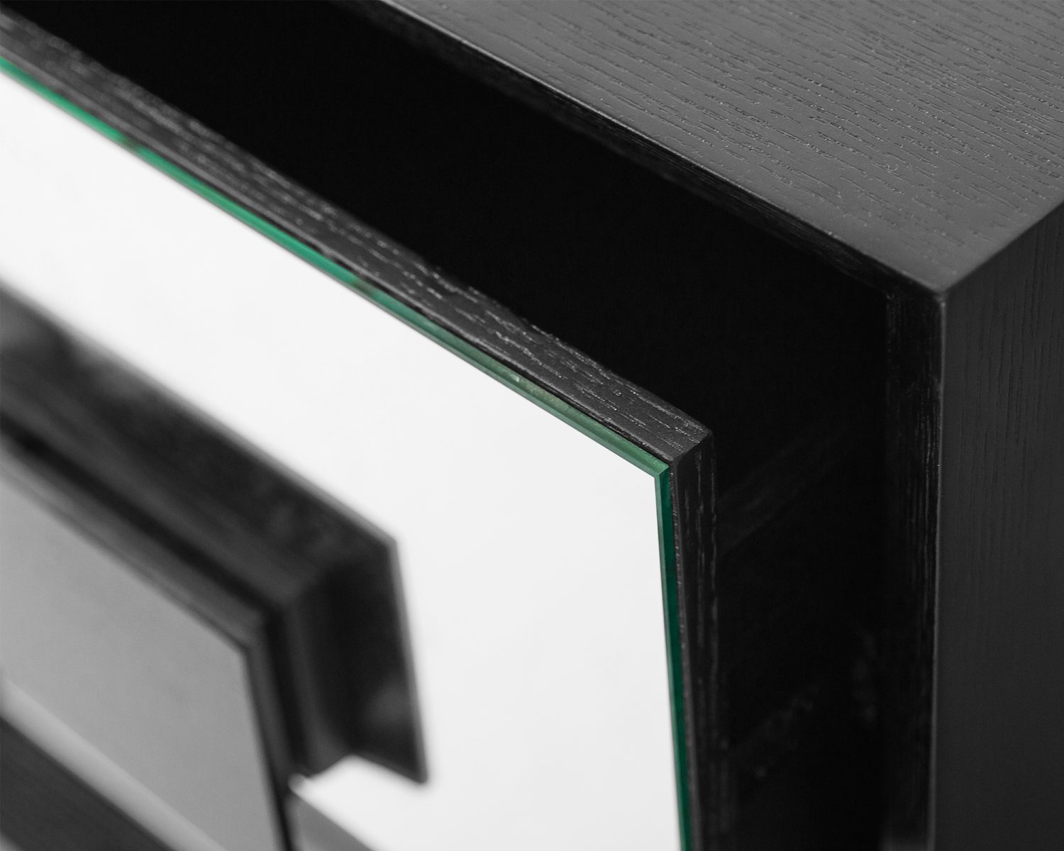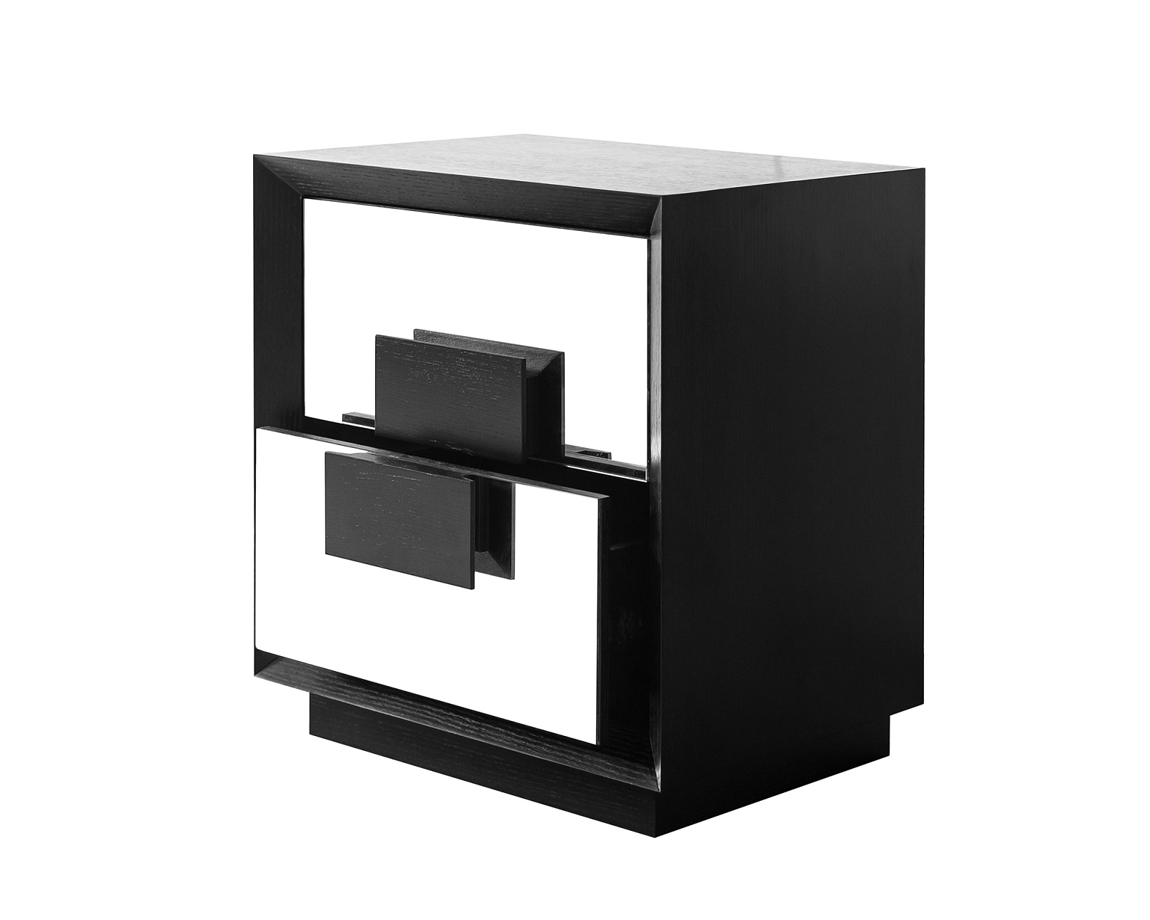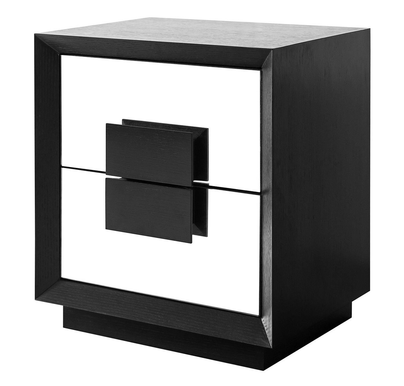 Прикроватная тумба ETNA от премиального Английского бренда LIANG AND EIMIL. Корпус обработан черным шпоном ясеня. Фасады двух выдвижных ящиков декорированы зеркалом. Фурнитура в цвет корпуса, в виде прямоугольников, образующих квадрат. Основание невысокое, стальное.