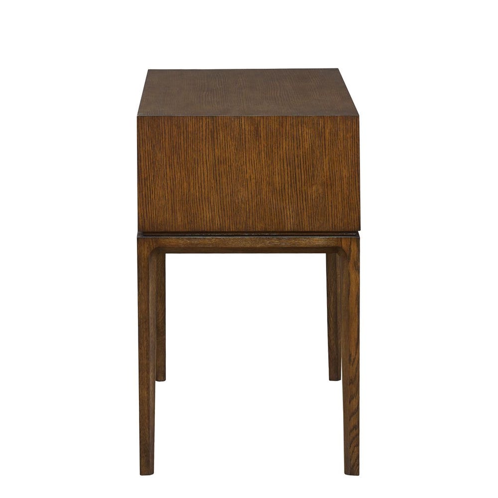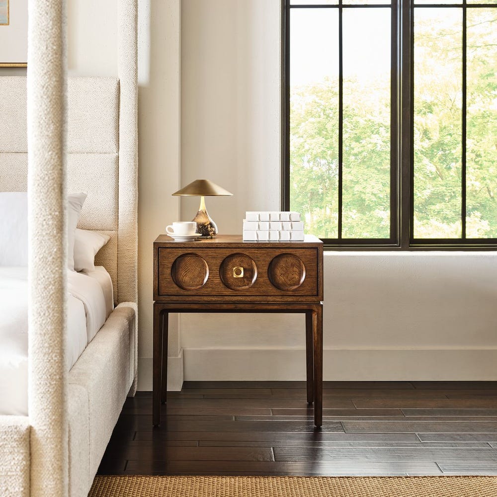 Тумбочка Roundabout от премиального американского бренда Uttermost. Выдвижной ящик украшен вставками из капа, обрамленными круглыми рамами. Модель изготовлена из массива американского белого дуба и шпона дуба, а также оснащена эксклюзивной массивной латунной ручкой. Столешница со всех сторон окрашена в светло-коричневый цвет.