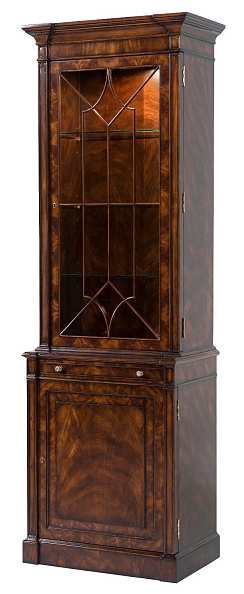 Витрина в стиле Георга III выполнена из красного дерева, шпонирована пламеннным махагоном. Визуально витрина разделена на две части: верхняя, со стеклянной дверцей, оформленной готическим орнаментом, тремя стеклянными полочками и внутренней подсветкой; и нижняя секция с деревянной дверцей и одной регулируемой полочкой. Витрина декорирована бронзовой фурнитурой.