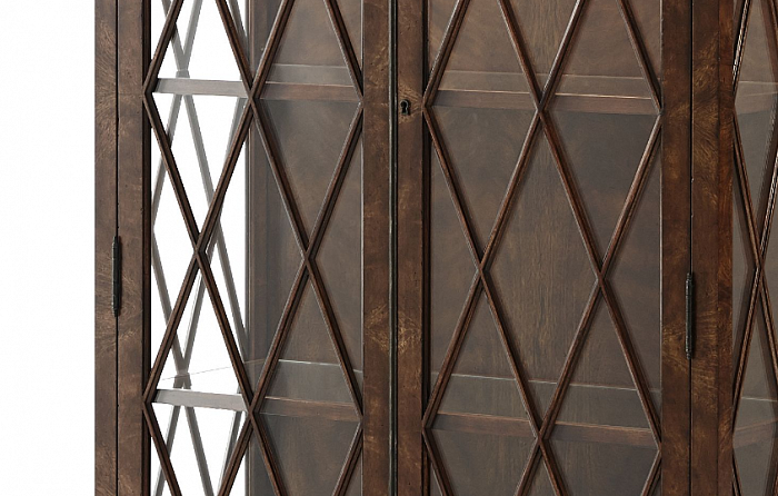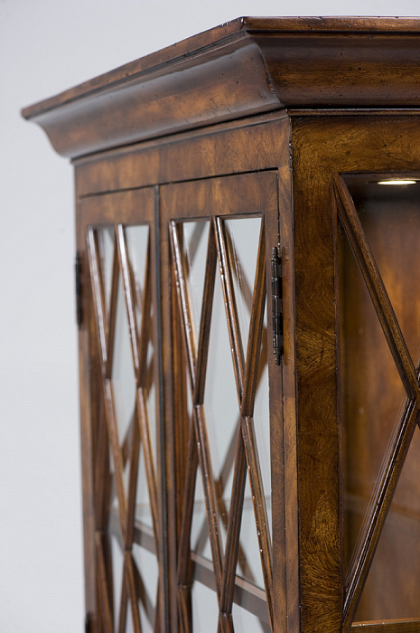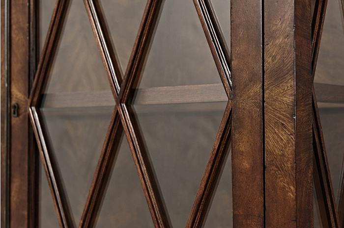 Витрина, вдохновленная оригиналом середины XX века, выполнена из красного дерева, декорирована шпоном амбурана цеаренсис. Предмет застеклен с трех сторон. Торцевые стороны и дверцы по всей высоте декорированы деревянной крестообразной решеткой. Есть встроенная LED-подсветка.