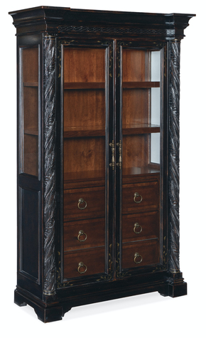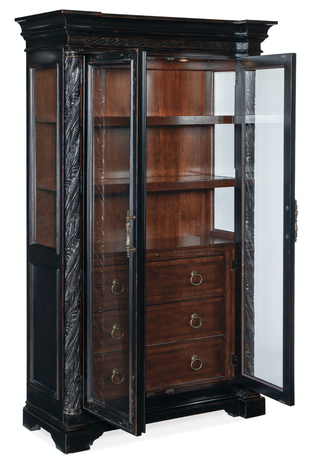 Витрина Charleston от американского премиального бренда Hooker Furniture изготовлена из вишневого шпона. Две распашные дверцы дополнены вставками из закаленного стекла. Внутри витрины находится две регулируемые стеклянные полки в деревянной раме, три выдвижных самозакрывающихся ящиков и одна выдвижная рабочая панель. Витрина оснащена подсветкой с сенсорным переключателем.
