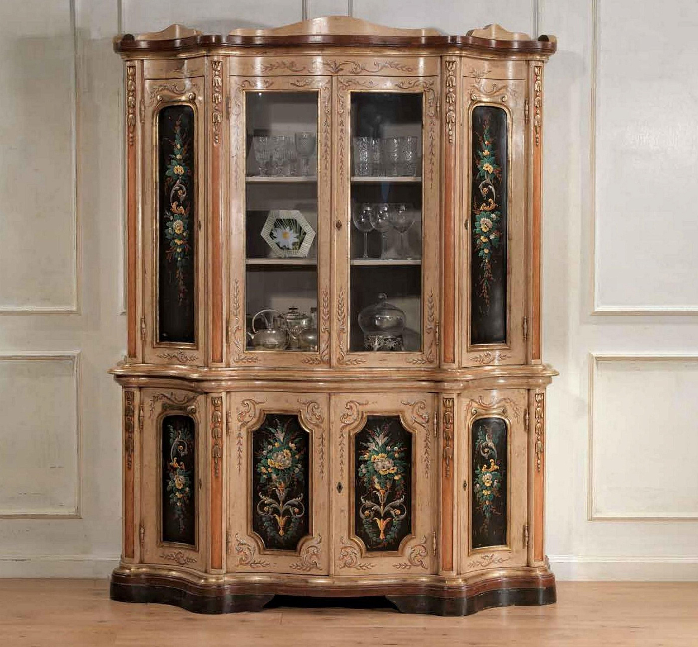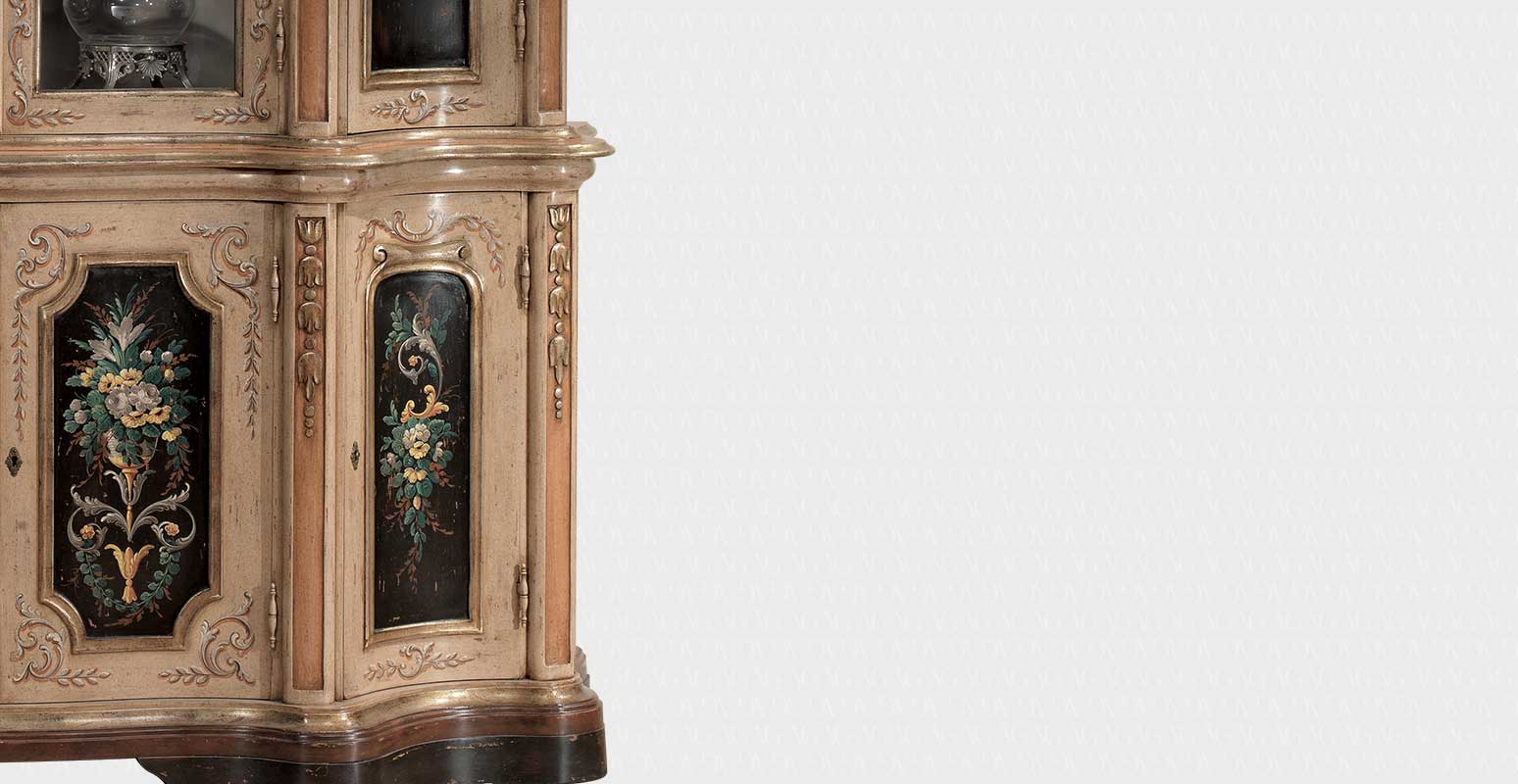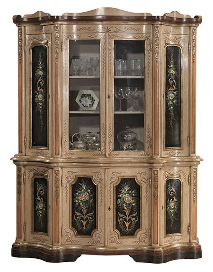 Витрина для хрусталя от премиального итальянского бренда Vittorio Grifoni. Конструкция состоит из двух центральных и четырех боковых отделений, закрывающихся на ключ. Внутри деревянные полочки. На фото финиш с декоративным цветочным принтом. На выбор предлагается 4 класса сочетаний цветов и текстур и несколько вариантов декоративной обработки корпуса.