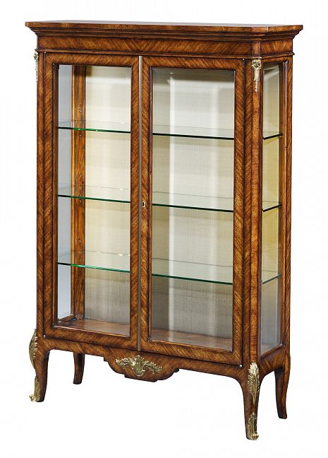 Витрина от премиального американского бренда THEODORE ALEXANDER. Классическое исполнение из красного дерева с отделкой дорогой породой шпона с интересным узором. Дверцы и боковые стороны со вставками прозрачного стекла. Внутреннее пространство разделено тремя стеклянными полочками. Задняя стенка белая. Корпус украшен резными элементами из латуни.