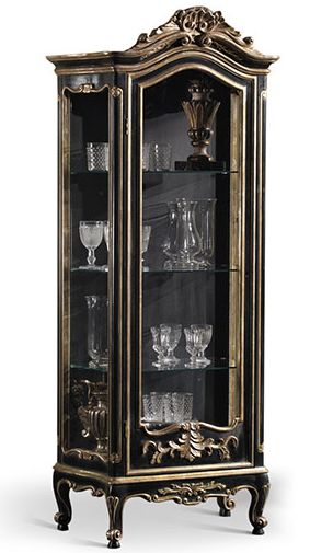 Витрина для посуды от премиального итальянского бренда Vittorio Grifoni. Конструкция состоит из одного отделения с распашной дверью, закрывающегося на ключ. Внутри стеклянные полочки. На фото финиш флорентийское серебро (Argento fiorentino). На выбор предлагается 4 класса сочетаний цветов и текстур и несколько вариантов декоративной обработки корпуса.