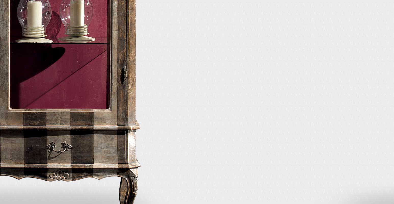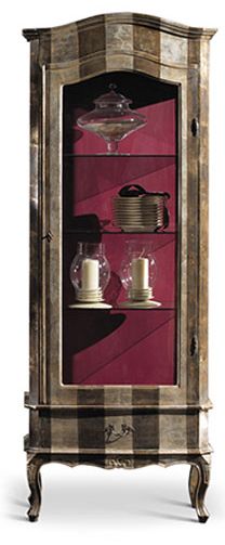 Витрина для посуды от премиального итальянского бренда Vittorio Grifoni. Конструкция состоит из одного отделения с распашной дверью, закрывающегося на ключ. Внутри стеклянные полочки. На фото финиш серебряный лист (Foglia argento). На выбор предлагается 4 класса сочетаний цветов и текстур и несколько вариантов декоративной обработки корпуса.