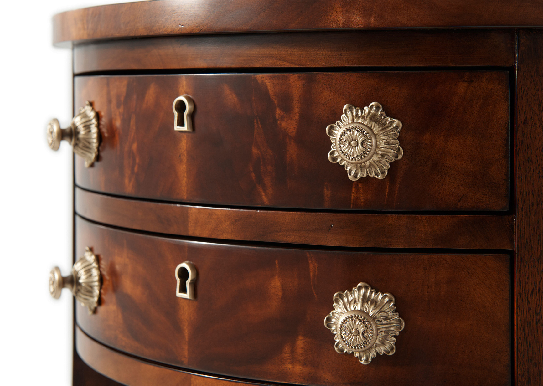 Данное изделие может быть использовано и как в качестве прикроватного столика, так и в качестве консоли. Модель выполнена под вдохновением серии Rep-li-ca в стиле Георга III и выполнена в форме demi-lune из красного дерева, оснащенная двумя центральными фризовыми ящиками с бронзовыми круглыми ручками. Консоль стоит на четырех квадратных ножках, сужающихся книзу и соединенных мещанкой. Завершения ножек защищены бронзовыми накладками. Оригинал начала XIX века был продан на аукционе за 6,650$.