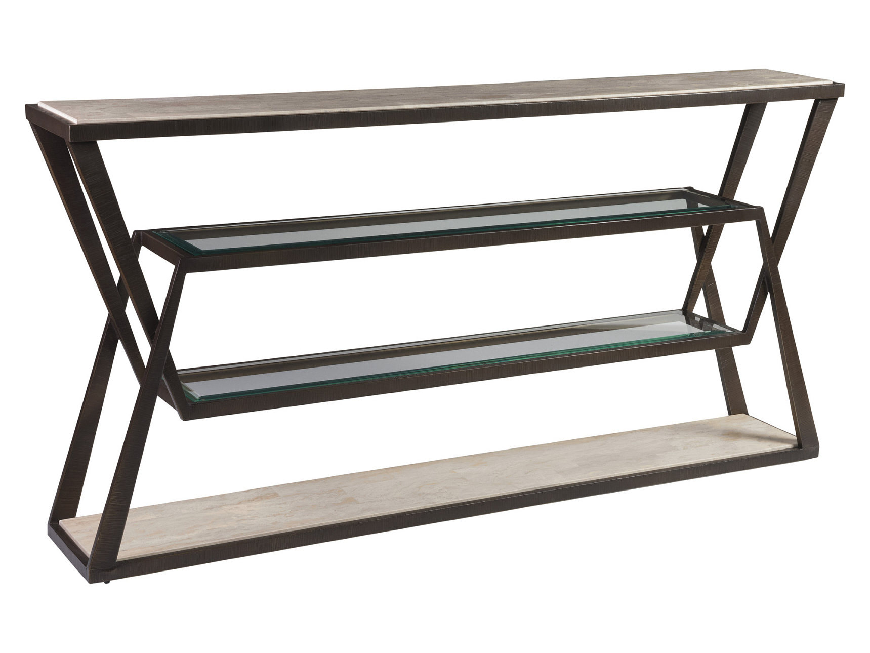 Стол Adamo из коллекции Signature Designs от премиального американского бренда Artistica Home для Lexington. Стальное основание с ребристой коричневой отделкой, столешница из травертина Desert и две полки из закаленного стекла со скошенными краями. Внешний вид и цвет столешниц могут отличаться.