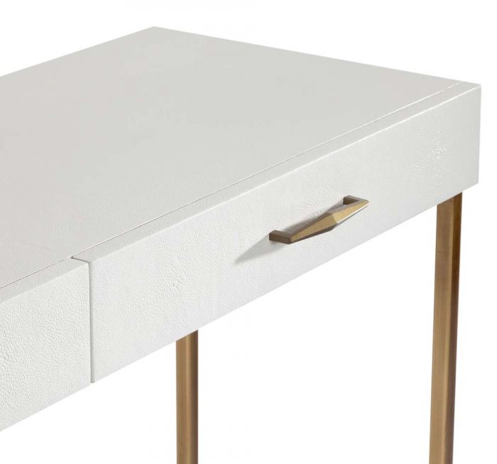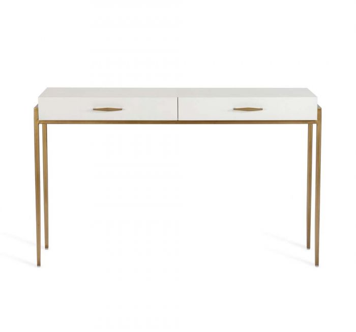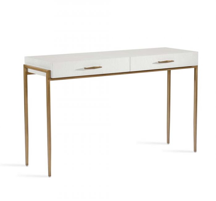 Стол-консоль Morand от премиального американского бренда Interlude Home изготавливается из дерева в белом цвете, искусственной шагреневой кожи и металла в отделке античная латунь.