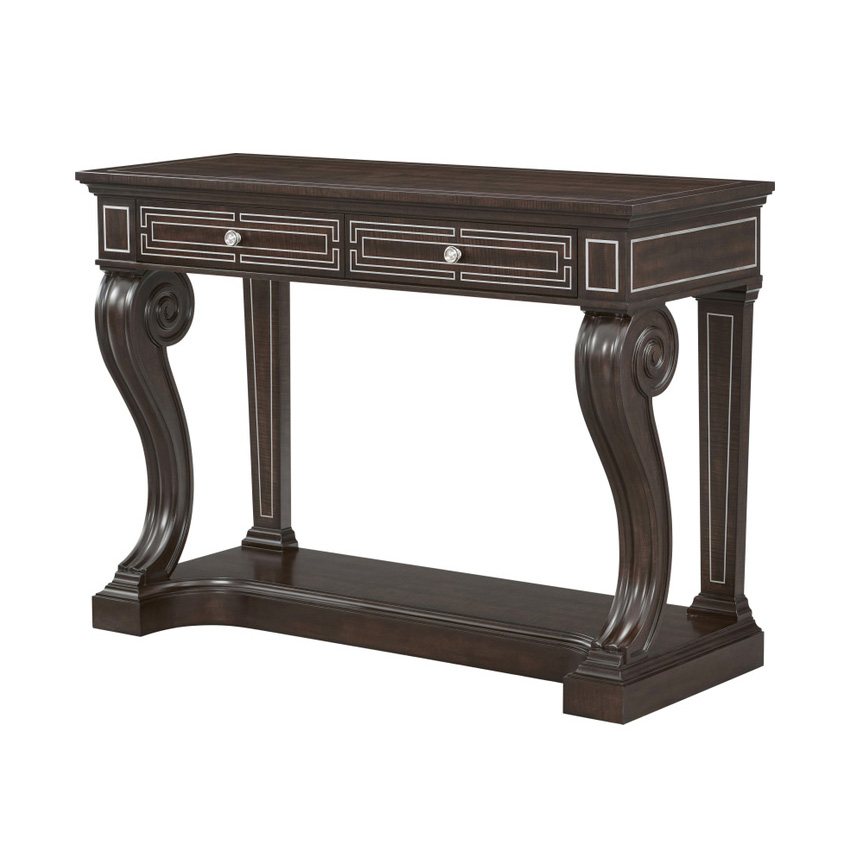 Консоль Spencer London от американского премиального бренда Theodore Alexander изготавливается из массива дерева и шпона. Металлические элементы в латунной отделке. Имеется два выдвижных ящика. Основание стола украшено витиеватой резьбой с завитками.