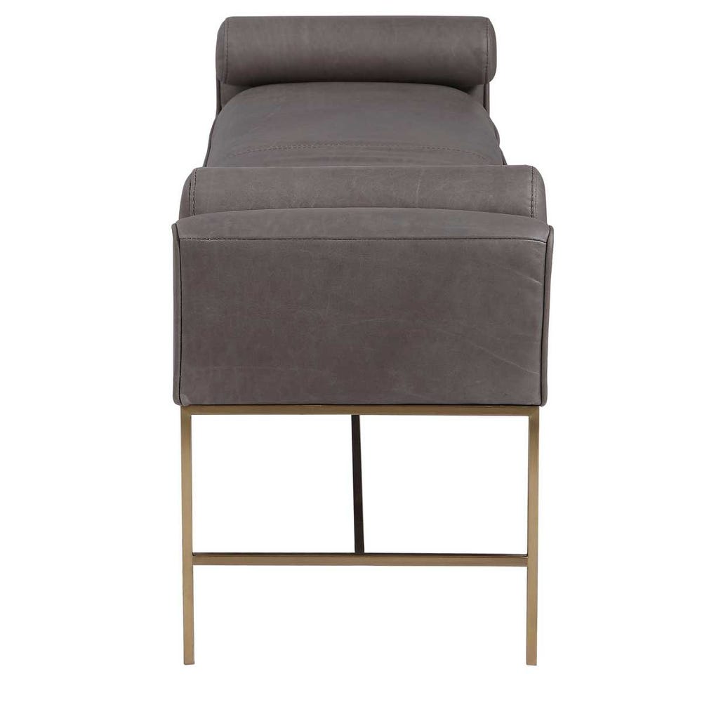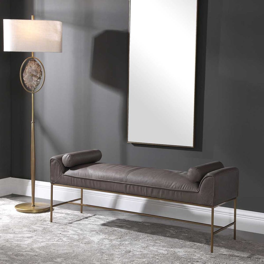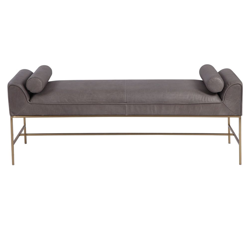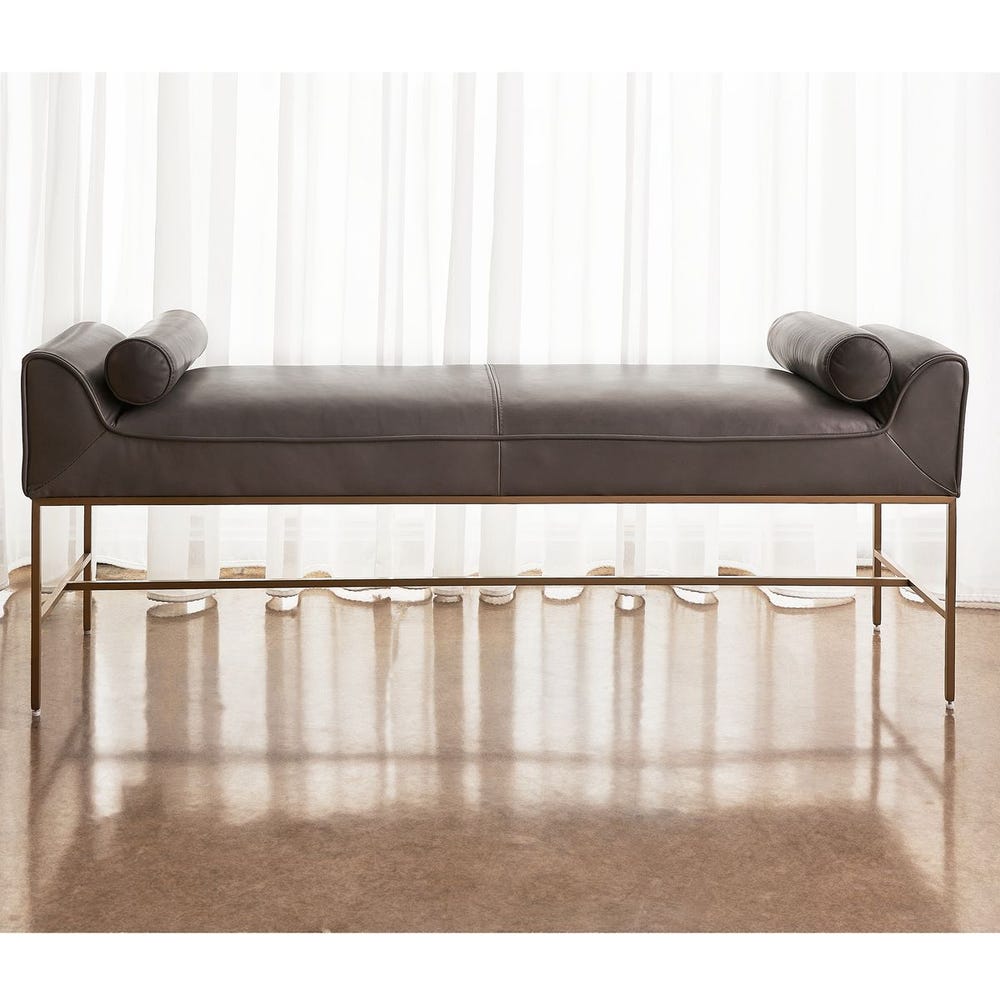 Банкетка Coco от премиального американского бренда Uttermost. Модель обтянута натуральной кожей насыщенного темно-серого цвета с металлическим основанием, покрытым лаком в цвете матовая латунь, и двумя подушками в тон. Поскольку кожа — это натуральный материал, ее текстура и цвет могут немного отличаться.