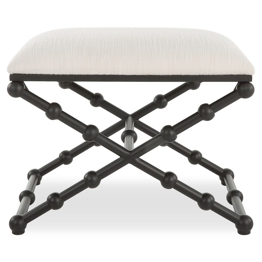 Банкетка Iron Drops от премиального американского бренда Uttermost. Благодаря оригинальным ножкам в форме пузырей эта модель приобретает утончённый вид и становится заметным элементом в любом доме. Она изготовлена из металла с сатиновой чёрной отделкой, а мягкое сиденье выполнено из белой полиэфирной ткани с текстурированной поверхностью и специальной обработкой для защиты от загрязнений.