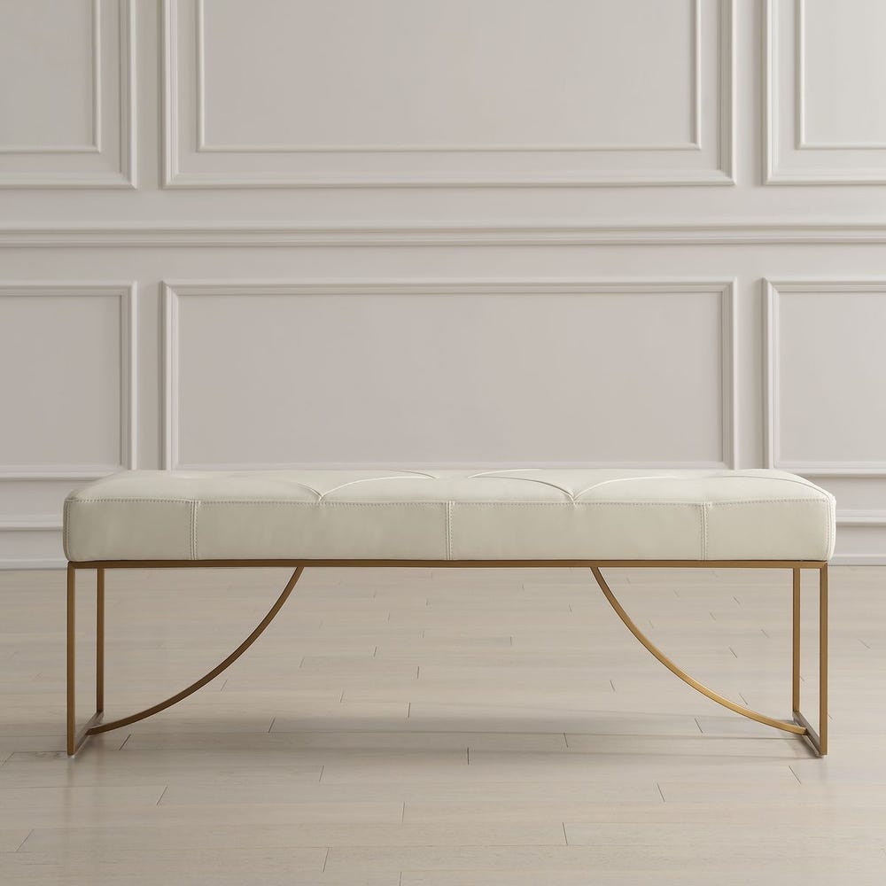 Банкетка Swale от премиального американского бренда Uttermost. Элегантные изгибы основания из металла с покрытием в цвете матовой латуни подчеркивают роскошь сиденья с ромбовидной прострочкой, обитого натуральной кожей цвета слоновой кости. Поскольку кожа — натуральный продукт, ее текстура и цвет могут немного отличаться, что придает ей уникальность.