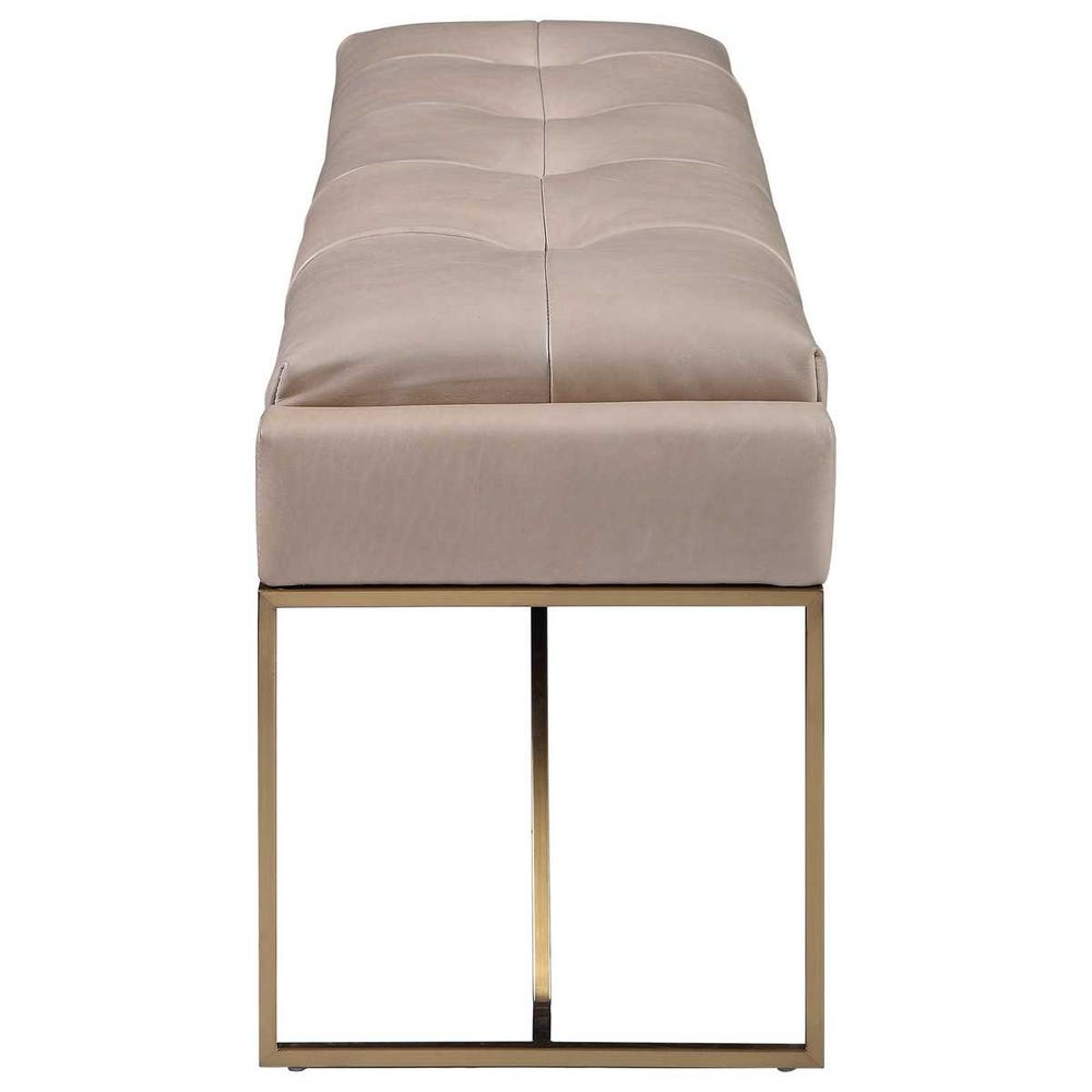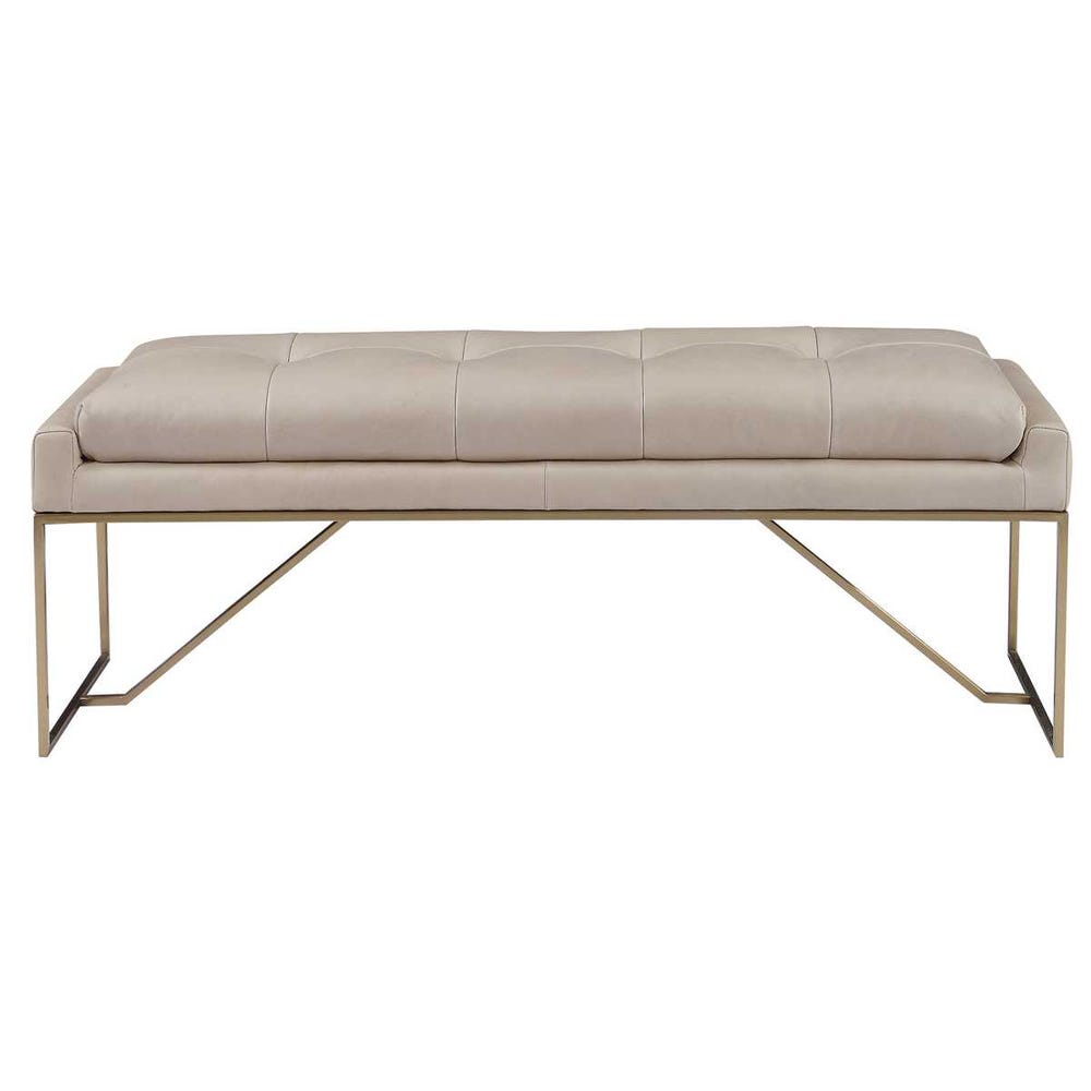 Банкетка Trestle от премиального американского бренда Uttermost. Модель выполненная из натуральной кожи теплого оттенка латте, имеет мягкое сиденье украшенное пуговицами и угловатое основание из металла с отделкой из матовой латуни. Поскольку кожа — это натуральный продукт, ее текстура и цвет могут незначительно отличаться.