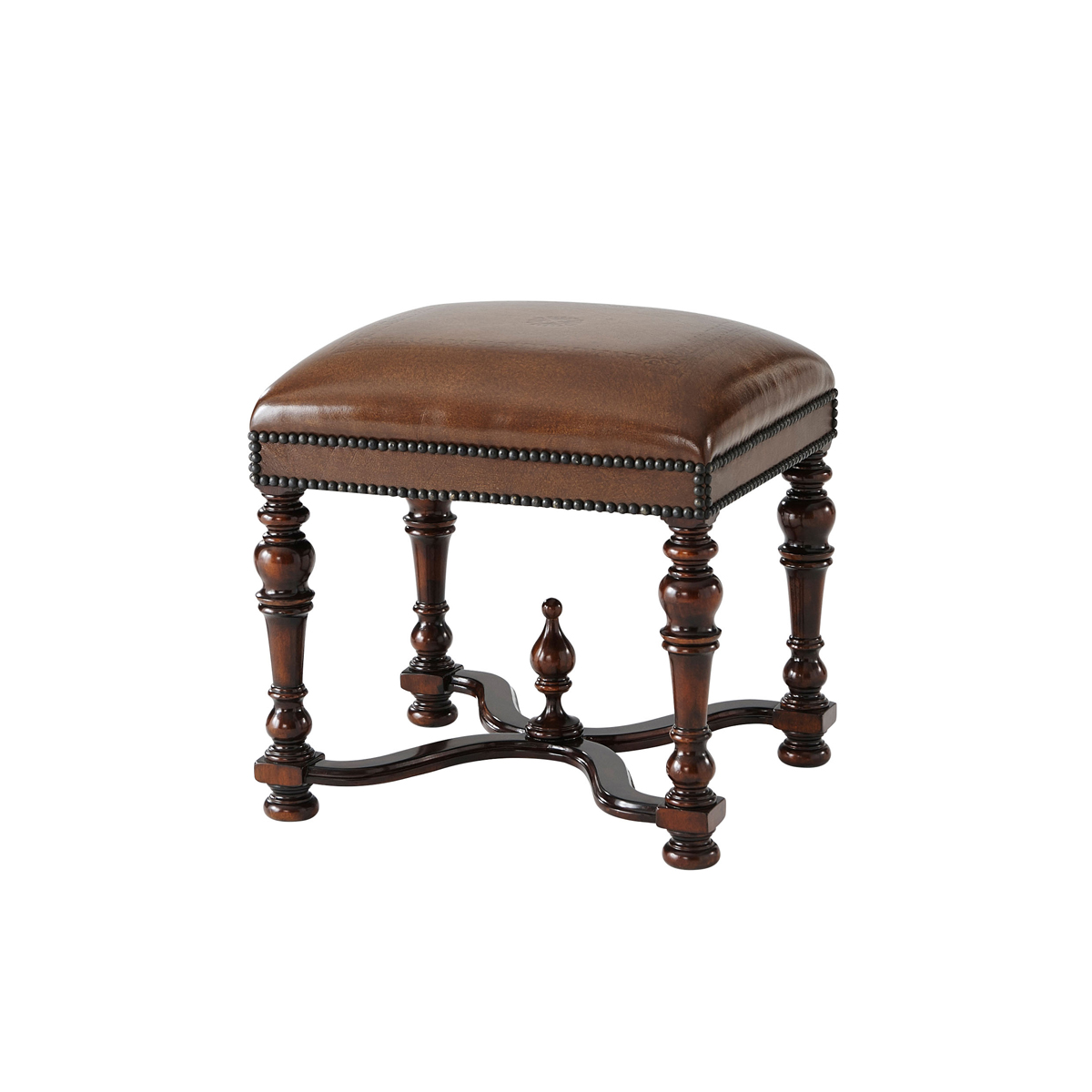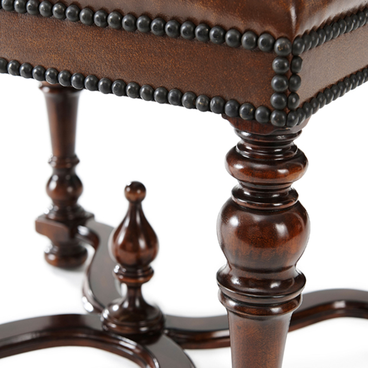 Банкетка Wavy от премиального американского бренда Theodore Alexander. Основание стула сделано из массива дерева, обивка сиденья — кожаная. Для украшения использованы декоративные гвоздики.