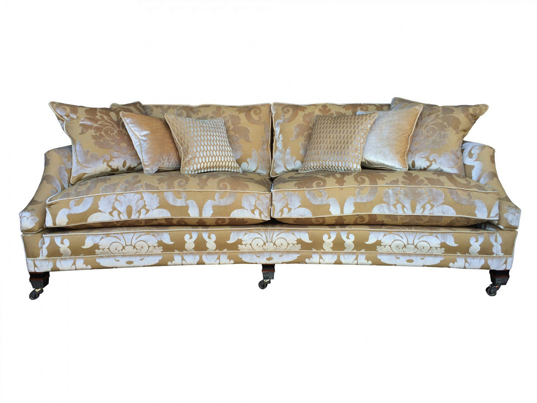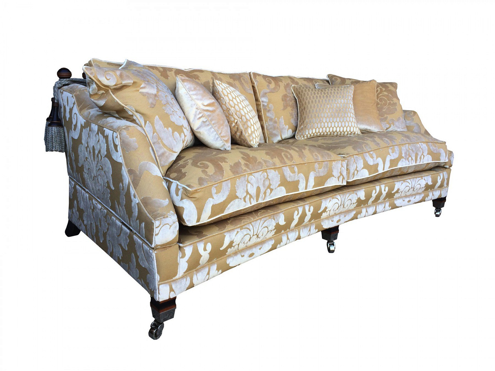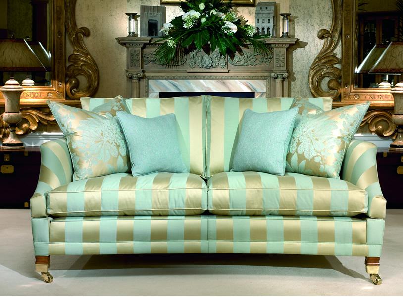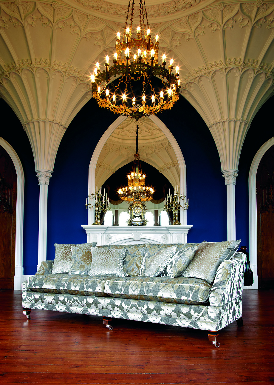 Каркас дивана выполнен из экологически чистой твердой породы дерева, подушки наполнены гипоаллергенным гусиным пухом, полированные ножки дополнены латунными колесиками.