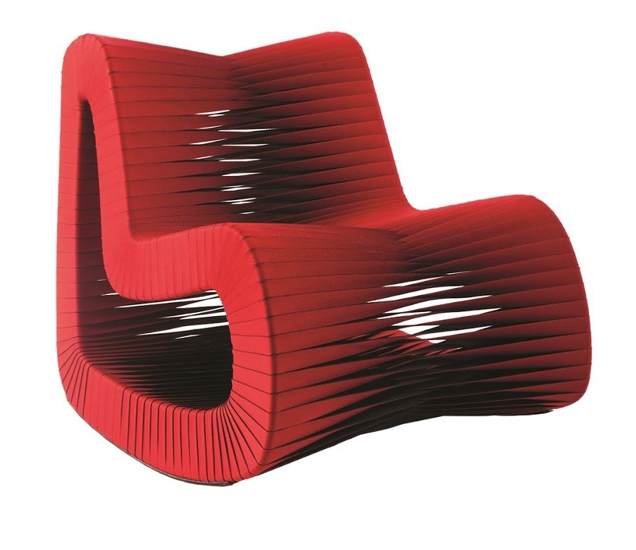 Кресло Seat Belt Rocking от премиального американского бренда Phillips Collection. Интересное дизайнерское решение. Коллекция была создана дизайнером из Таиланда Nuttapong Charoenkitivarakorn, получившем награду за свое изобретение. Вдохновением послужил визит на швейную фабрику, где он увидел переплетенные нити многочисленных катушек. Эта модель легко узнаваема, за счет поразительного дизайна плетеной спинки и профиля, напоминающего туфлю на шпильке. Поликоттоновые ремни оплетают деревянный каркас, усиленный металлом. Это однотонная красная модель.