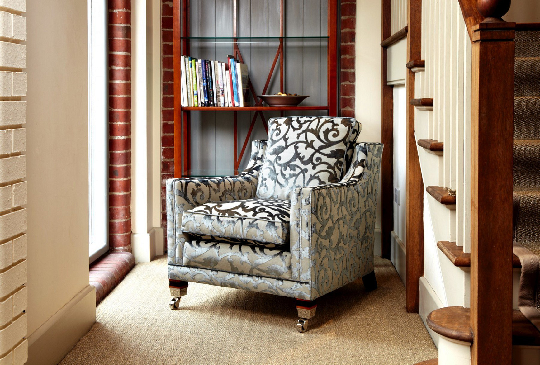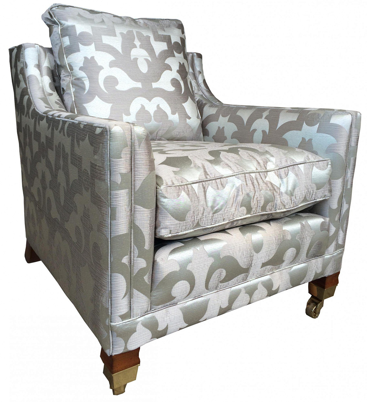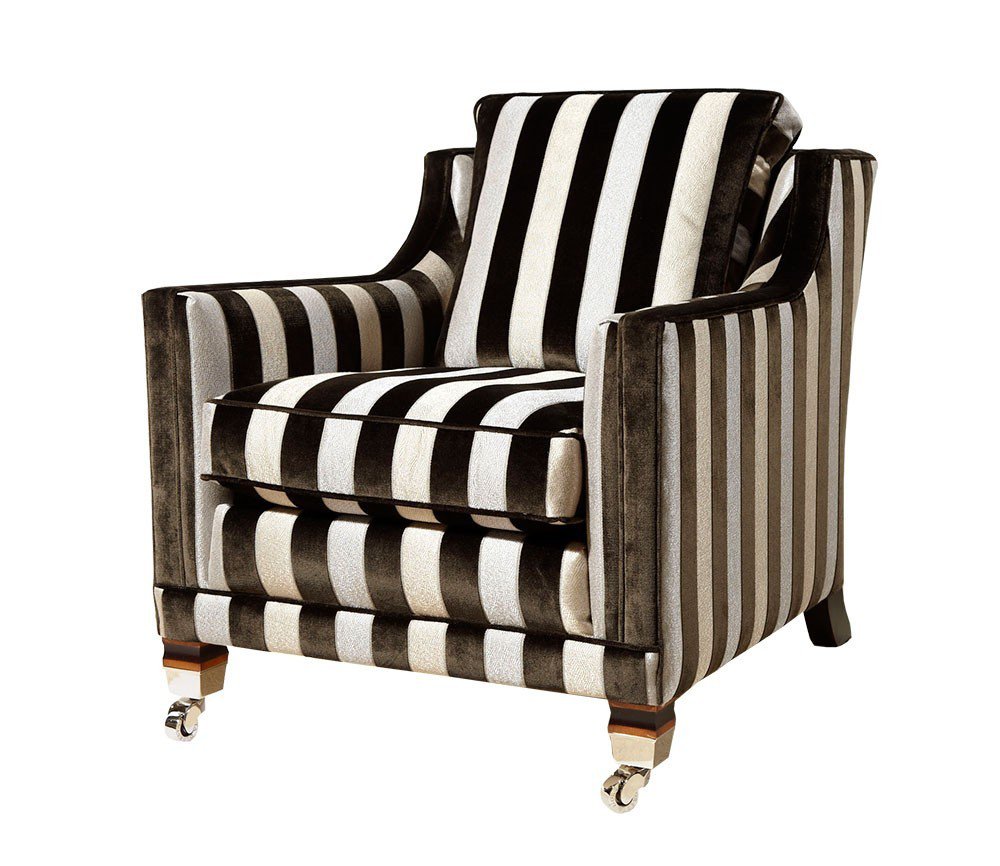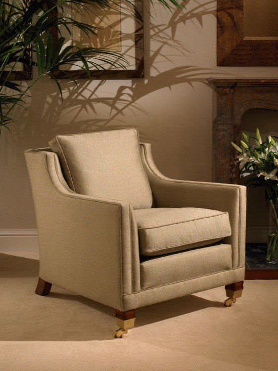 Каркас кресла выполнен из экологически чистой твердой породы дерева, подушки наполнены гипоаллергенным гусиным пухом, полированные ножки дополнены латунными колесиками.