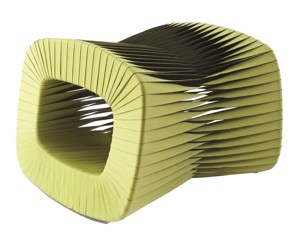 Оттоманка Seat Belt от премиального американского бренда Phillips Collection. Интересное дизайнерское решение. Коллекция была создана дизайнером из Таиланда Nuttapong Charoenkitivarakorn, получившем награду за свое изобретение. Вдохновением послужил визит на швейную фабрику, где он увидел переплетенные нити многочисленных катушек. Поликоттоновые ремни оплетают деревянный каркас, усиленный металлом. Это однотонная зеленая модель.