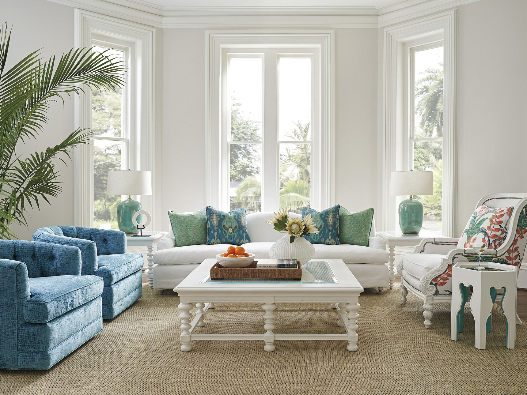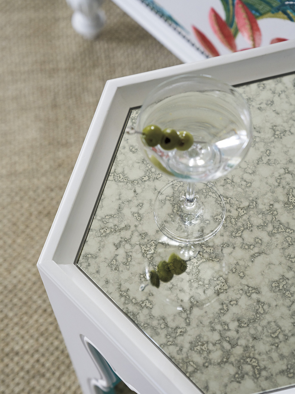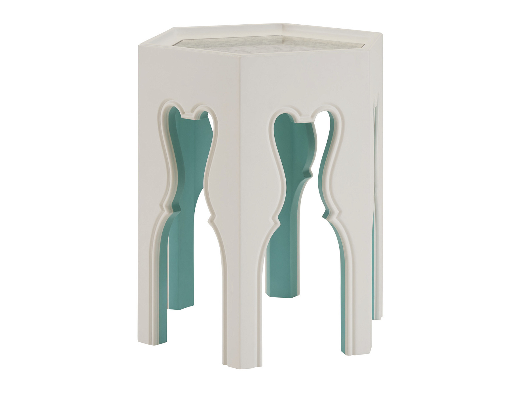 Столик Bilbao из коллекции Villa Blanca от премиального американского бренда Barclay Butera для Lexington. Шестиугольный столик — это визитная карточка бренда. Классический мавританский дизайн включает в себя столешницу с зеркальной инкрустацией под старину на белом основании. Открытая внутренняя часть представлена в трех вариантах цвета: каштановый, коралловый и бирюзовый.