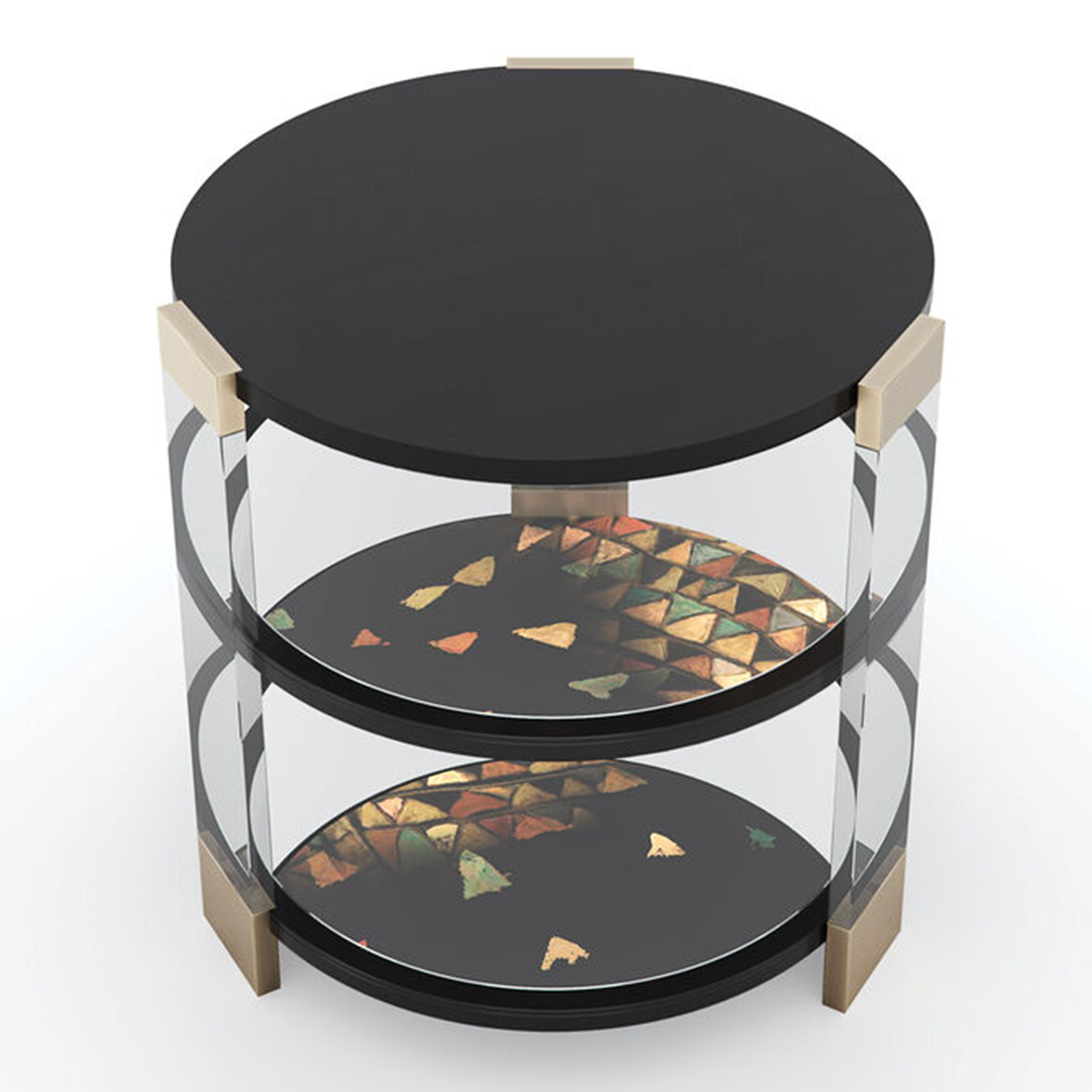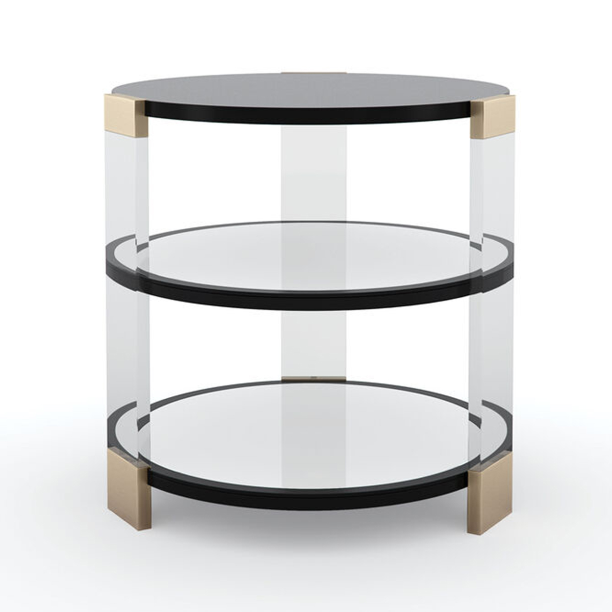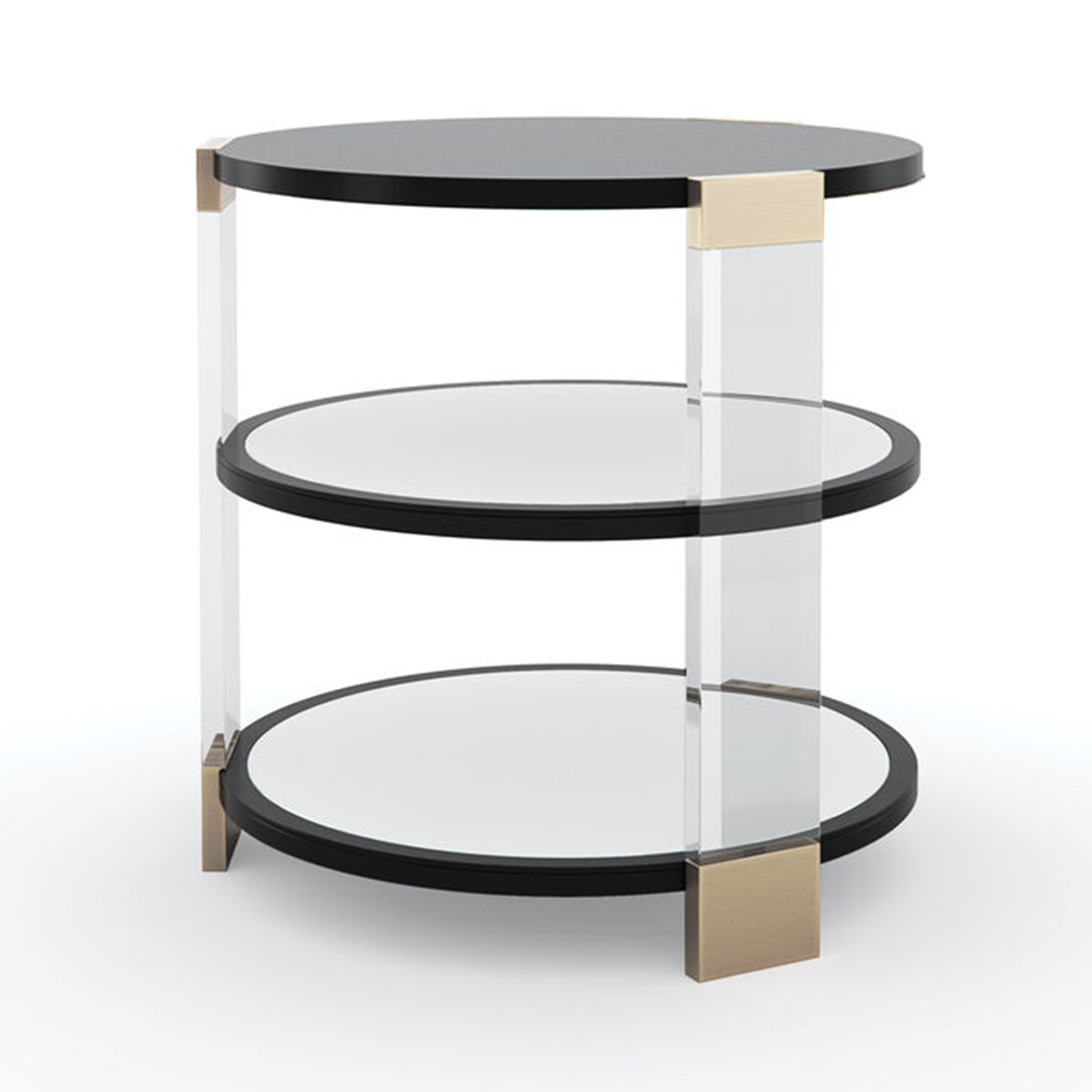 Столик Go Around It от премиального американского бренда Caracole. Столешница и две полки в отделке Tuxedo Black, кажется, парят в прозрачных акриловых стойках, создавая впечатление, вызывающее интерес, но не навязчиво. Еще больше привлекательности создают центральная и нижняя полки, которые имеют зеркальное отражение, выполненном в цифровом виде и нанесенном вручную под полкой выше.