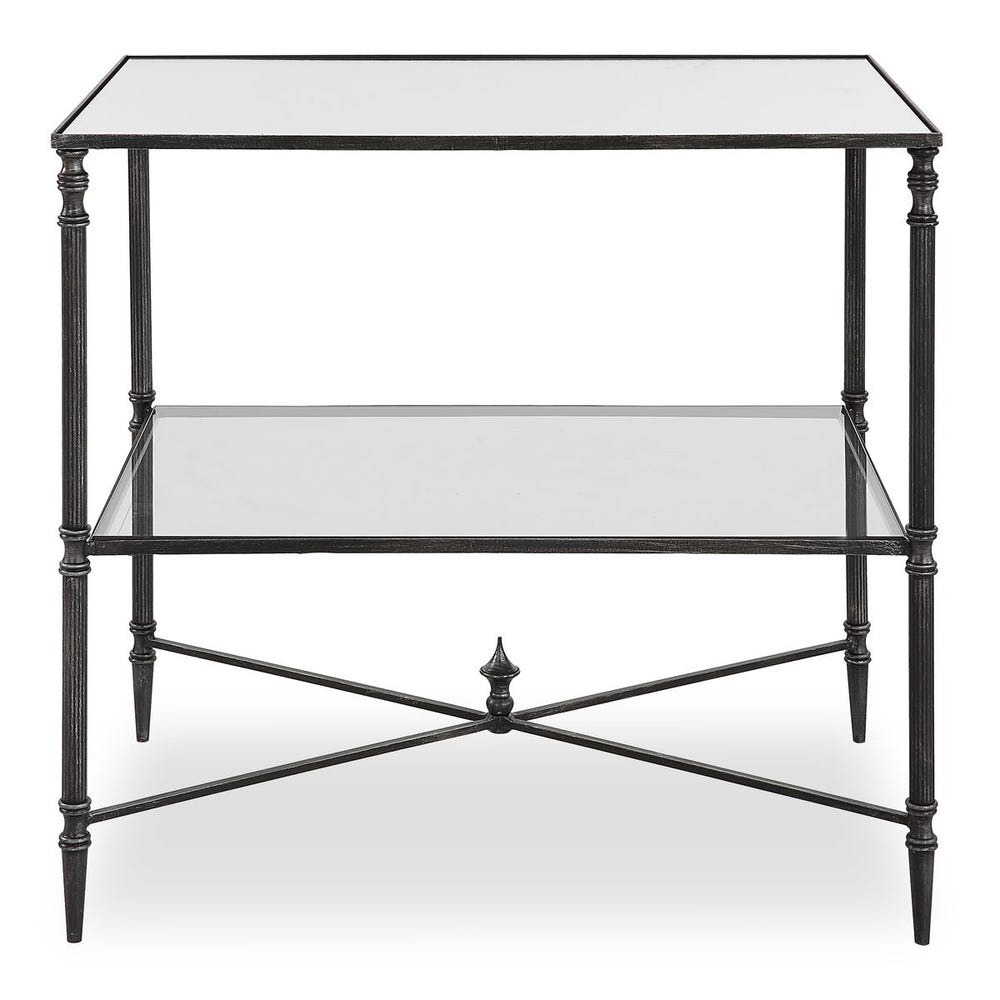 Столик Henzler от премиального американского бренда Uttermost. Основание выполнено из кованого металла в черной отделке с серебристыми бликами. Столешница из армированного зеркала и полка из закаленного стекла.