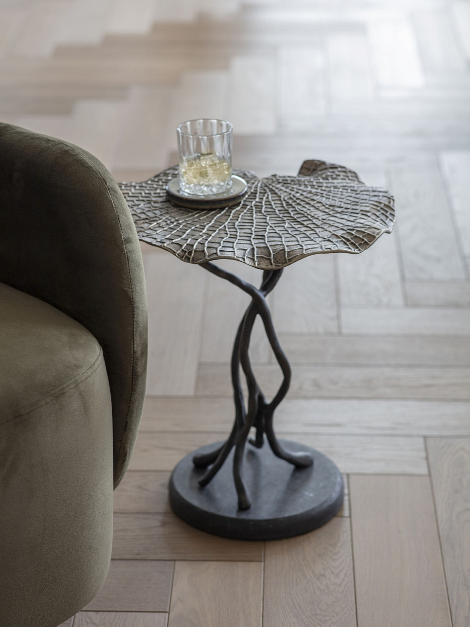 Столик Lily Pad Leaf от премиального английского бренда Libra. Отличается прочностью и в то же время плавной, древесной формой. Он изготовлен из литого алюминия и окрашен в угольно-черный и оловянный цвета. Ножки выполнены в форме ветвей и установлены на прочном основании, а листья с рельефными прожилками и рифлеными краями напоминают листья гинкго. Верхняя часть столика имеет едва заметный оттенок состаренной латуни, что придает этому уникальному предмету особую элегантность. Столик представлен в двух вариантах: с одним листом и с тремя листьями разного размера.