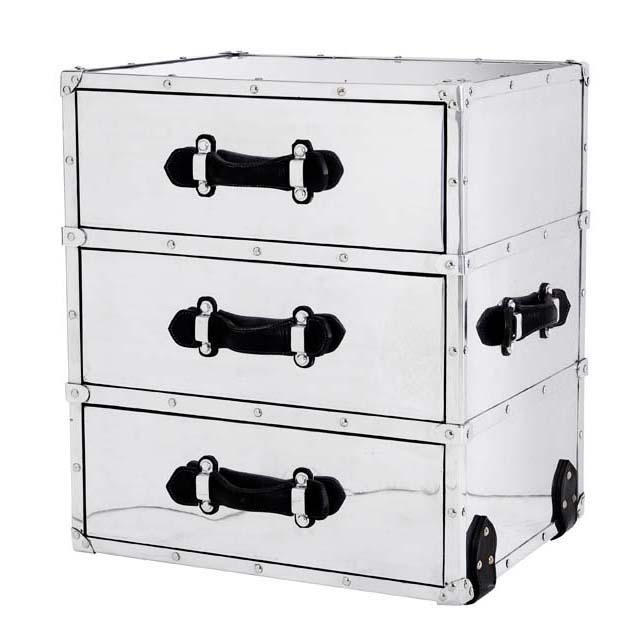 Столик Side Table Catalina от известного бренда Eichholtz. Корпус столика выполнен из алюминия. Стол имеет три выдвижных ящика с кожаными ручками.