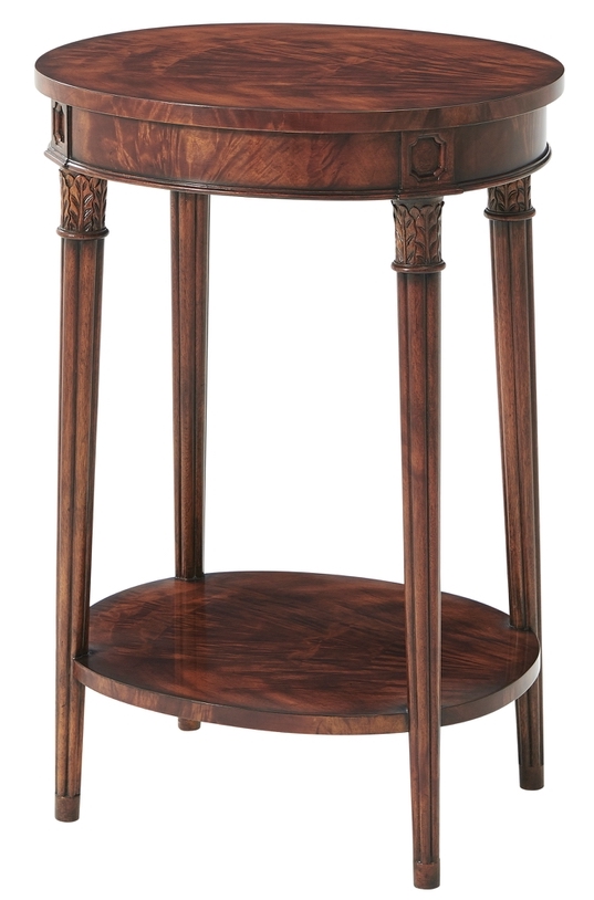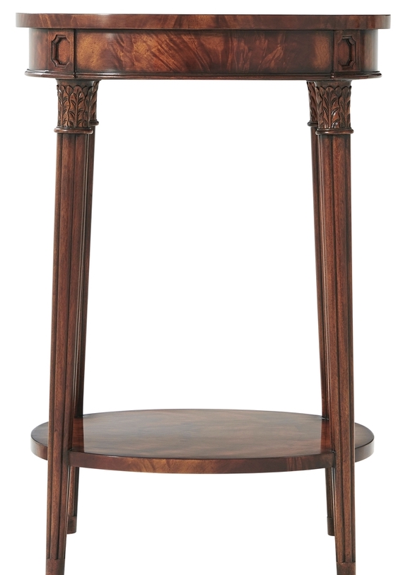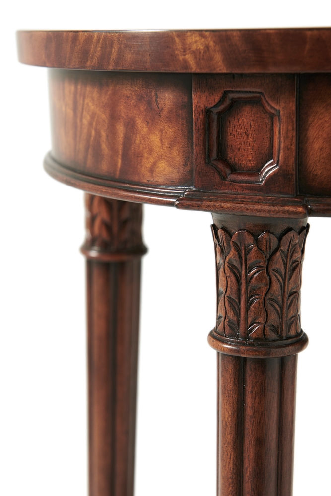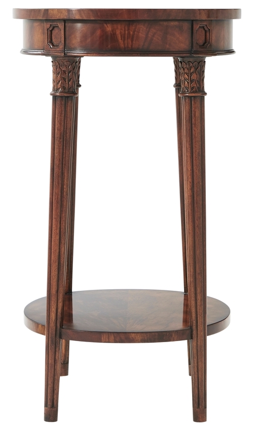 Столик выполнен в стиле ампир из красного дерева. Овальная столешница декорирована шпоном палисандра. Ножки объединены нижней панелью и готовы выдержать любую нагрузку.