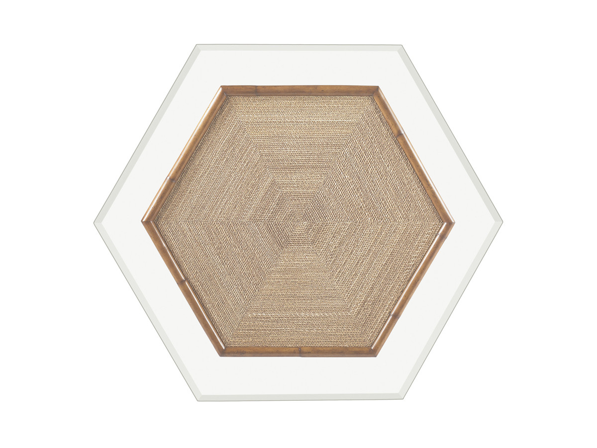 Столик Key Largo из коллекции Island Estate от премиального американского бренда Tommy Bahama. Шестиугольная плетеная основа из ротанга с кожаными вставками отражается в стеклянной шестиугольной столешнице. Плетеный верх основания из гибких стеблей растения также состоит из шести треугольников, которые повторяют форму столешницы, но при этом притягивают взгляд к центру.